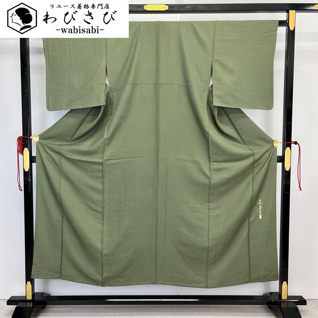 -説明- 作家物の色無地のお着物です。 幻の染、岩石染と題された灰緑色の品のある緑味のお色の素敵なお品でございます。 -状態- 【S】未使用で保管されていたお品です。 一部しつけ糸ございます。 スコッチガード加工。 -サイズ(cm)- 身丈:152 裄:63.5 肩幅:31.5 袖幅:32 袖丈:49 前幅:22.5 後幅:28 衽幅:15 裄出身頃:2 裄出袖:2.5 内揚:2.5 -仕立- 袷 広衿 一つ紋 -素材- 正絹 -管理番号- K-3355
