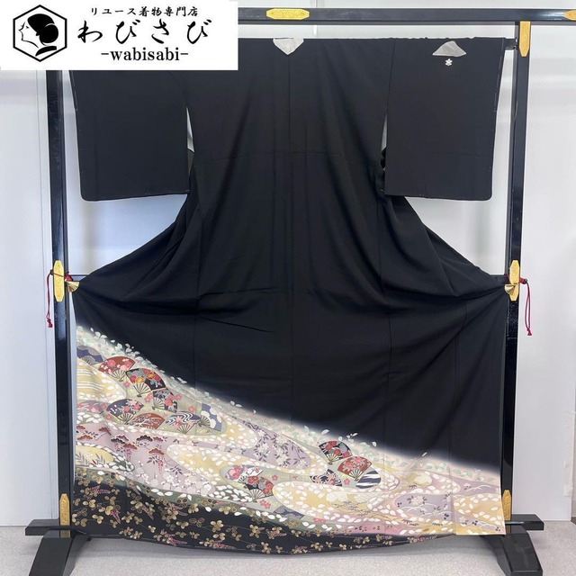 黒留袖 扇子に美しい花模様 七宝 花亀甲 金彩 K-4890 着物 きもの kimono 和服 和装 中古 リサイクル着物 【送料無料】