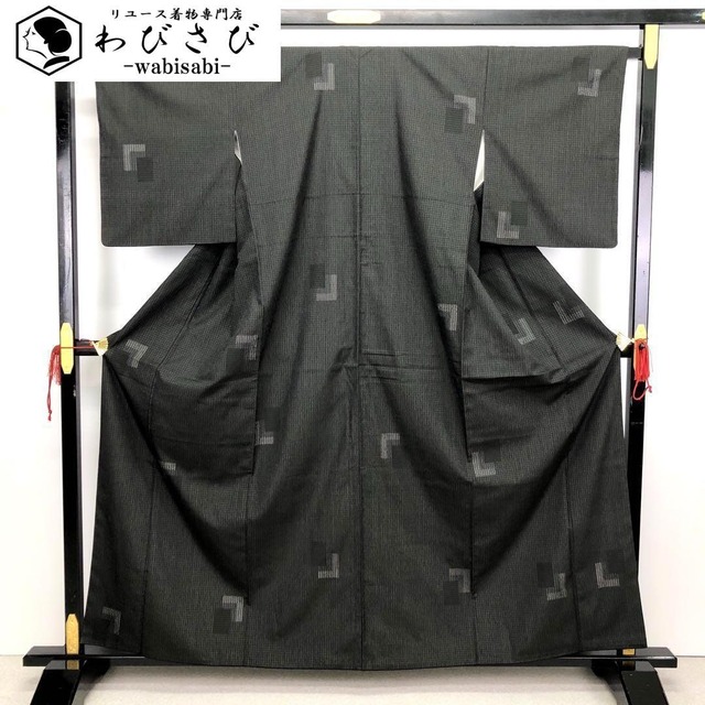 お召 モダンな四角模様 モノトーン 黒色 K-3022 着物 きもの kimono 和服 和装 中古 リサイクル着物 【送料無料】