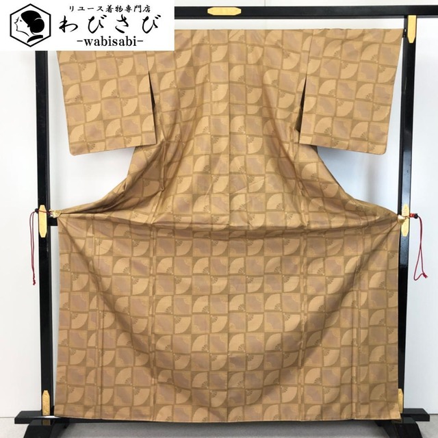 -説明- 本場大島紬のお着物です。 麦藁色のお色味に扇子柄がデザインされた雰囲気の良い素敵な柄裄のお品でございます。 -状態- 【S】未使用で保管されていたお品です。 しつけ糸ございます。 証紙付。 ほていやお誂え。 -サイズ(cm)- 身丈:168 裄:66 袖幅:34 袖丈:49.5 前幅:24 後幅:29.5 衽幅:15 裄出身頃:2.5 裄出袖:2.5 内揚:5 -仕立- 袷 単衣 広衿 衿:スナップ -素材- 正絹 -管理番号- K-5260