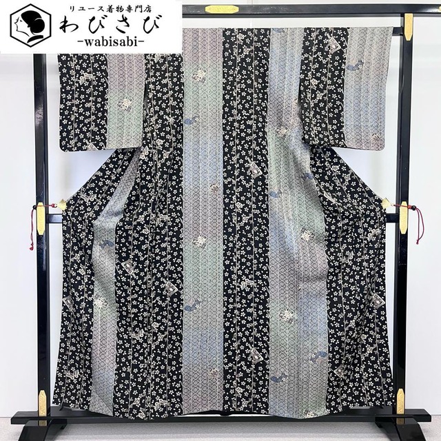 単衣 小紋 縦縞花模様 凧 羽子板 扇子 蝶々 縮緬 K-3936 着物 きもの kimono 和服 和装 中古 リサイクル着物 【送料無料】