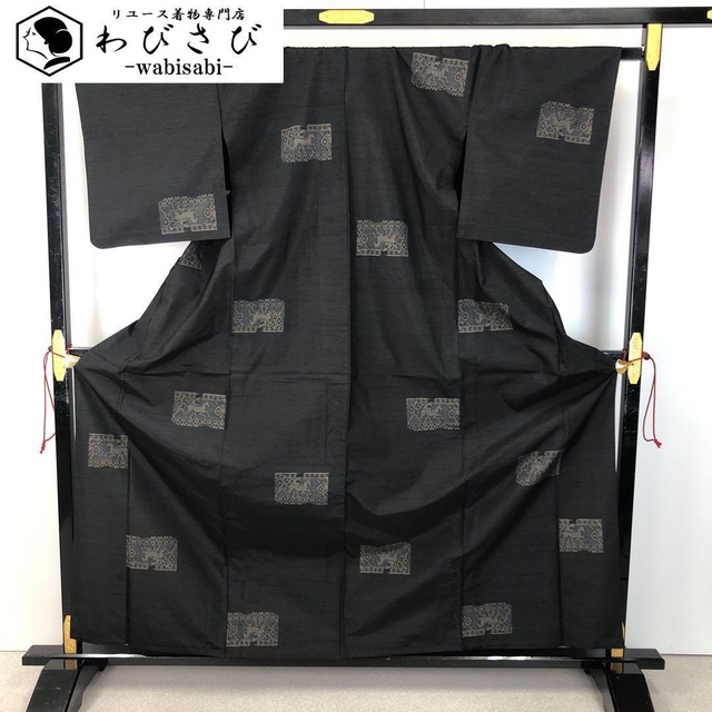 単衣 紬着物 四角に馬 騎士 墨色 K-4462 着物 きもの kimono 和服 和装 中古 リサイクル着物 【送料無料】