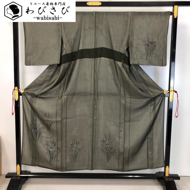 単衣 紗合せ 付下げ 流水に菖蒲 黒橡色 K-5129 着物 きもの kimono 和服 和装 中古 リサイクル着物 【送料無料】