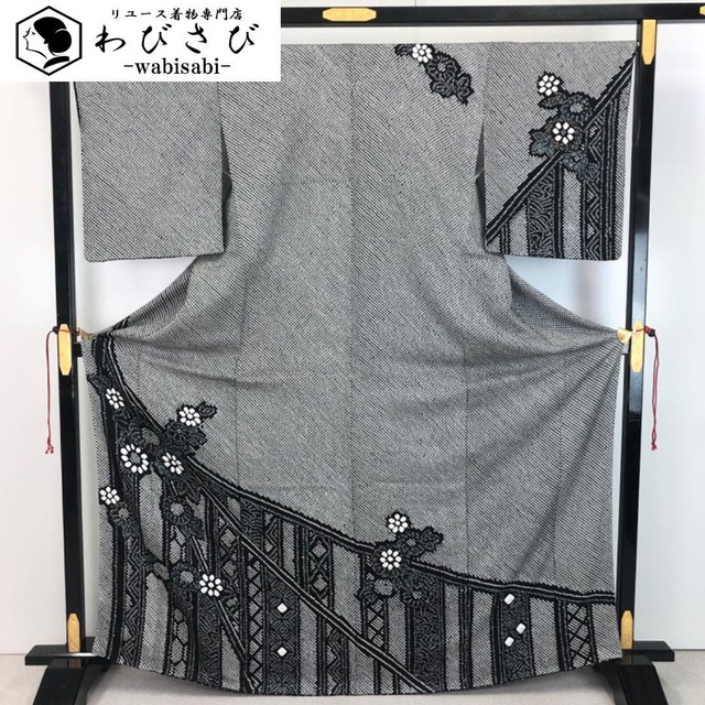 -説明- 付下げのお着物です。 黒色ベースのモノトーンのお色味の総絞り、流水に花模様の柄裄がデザインされた素敵なお品でございます。 -状態- 【A】目立つ汚れなど無く状態の良いお品です。 ガード加工。 -サイズ(cm)- 身丈:168 裄:69 袖幅:34.5 袖丈:49.5 前幅:27.5 後幅:32.5 衽幅:15.5 裄出身頃:0 裄出袖:0.5 内揚:0 -仕立- 袷 広衿 衿:スナップ 紋無 -素材- 正絹 -管理番号- K-5324