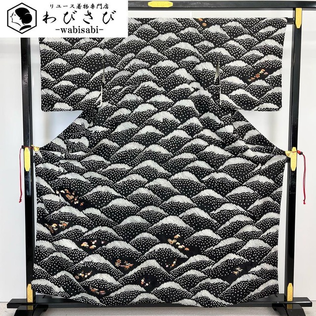 -説明- 訪問着のお着物です。 黒色ベースの総絞りに流水模様に金彩が使われた花模様がデザインされた雰囲気の良い素敵なお品でございます。 -状態- 【A】目立つ汚れなど無く状態の良いお品です。 左前身頃裾、八掛に写真の様な汚れございます。 ガード加工。 -サイズ(cm)- 身丈:160 裄:66 袖幅:32.5 袖丈:49 前幅:25.5 後幅:30.5 衽幅:15.5 裄出身頃:2 裄出袖:0 内揚:8 -仕立- 袷 広衿 紋無 -素材- 正絹 -管理番号- K-4401