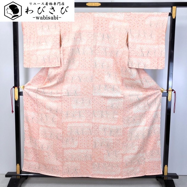 -説明- 小紋のお着物です。 曙色の優しいお色味に絞り柄の桜の木、七宝柄、青海波などの柄行がデザインされた雰囲気の良い素敵なお品でございます。 -状態- 【A】目立つ汚れなど無く状態の良いお品です。 しつけ糸ございます。 -サイズ(cm)- 身丈:159 裄:66 袖幅:33.5 袖丈:51.5 前幅:24 後幅:29 衽幅:15 裄出身頃:0 裄出袖:0 内揚:0 -仕立- 袷 広衿 衿:スナップ 紋無 -素材- 正絹 -管理番号- K-5147