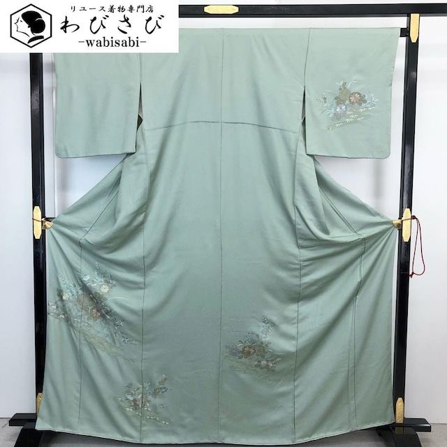 付下げ 相良刺繍 蘇州刺繍 四季の花模様 山葵色 トールサイズ K-4219 着物 きもの kimono 和服 和装 中古 リサイクル着物 【送料無料】