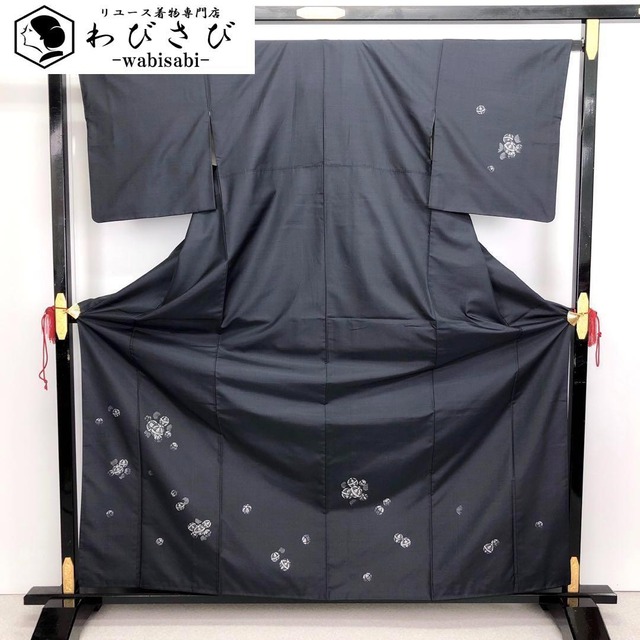 -説明- 付下げのお着物です。 黒色ベースのお色味に絞り柄の丸の中に花模様がデザインされた素敵な柄裄のお品でございます。 -状態- 【A】目立つ汚れなど無く状態の良いお品です。 ガード加工。 -サイズ(cm)- 身丈:169 裄:69 袖幅:34 袖丈:49 前幅:26 後幅:30 衽幅:15 裄出身頃:0.5 裄出袖:2 内揚:1 -仕立- 袷 広衿 紋無 -素材- 正絹 -管理番号- K-4346