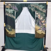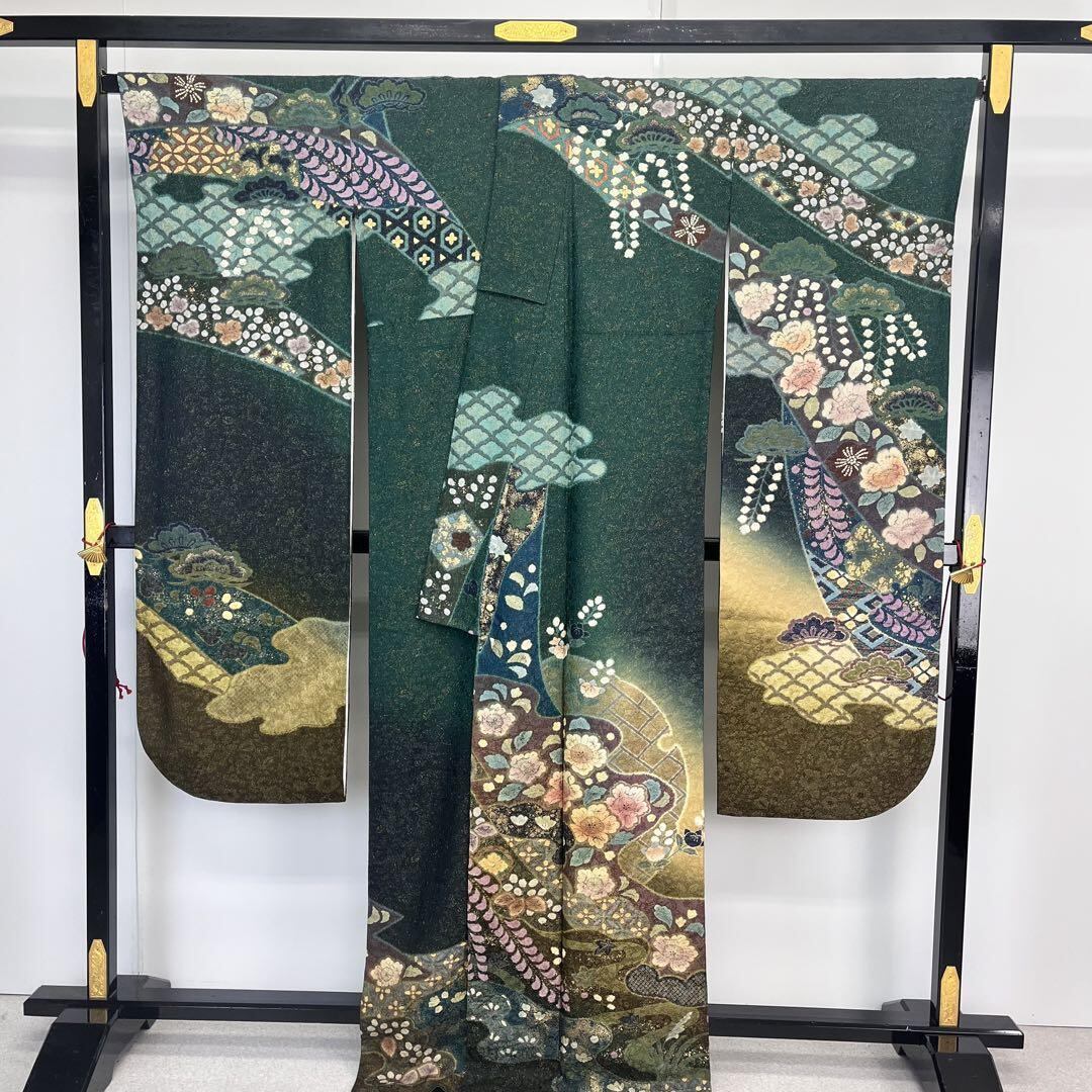 振袖 吉野一廉 辻が花絞り 襦袢付 金通し 海松藍色 トールサイズ K-4423 着物 きもの kimono 和服 和装 中古 リサイクル着物 【送料無料】