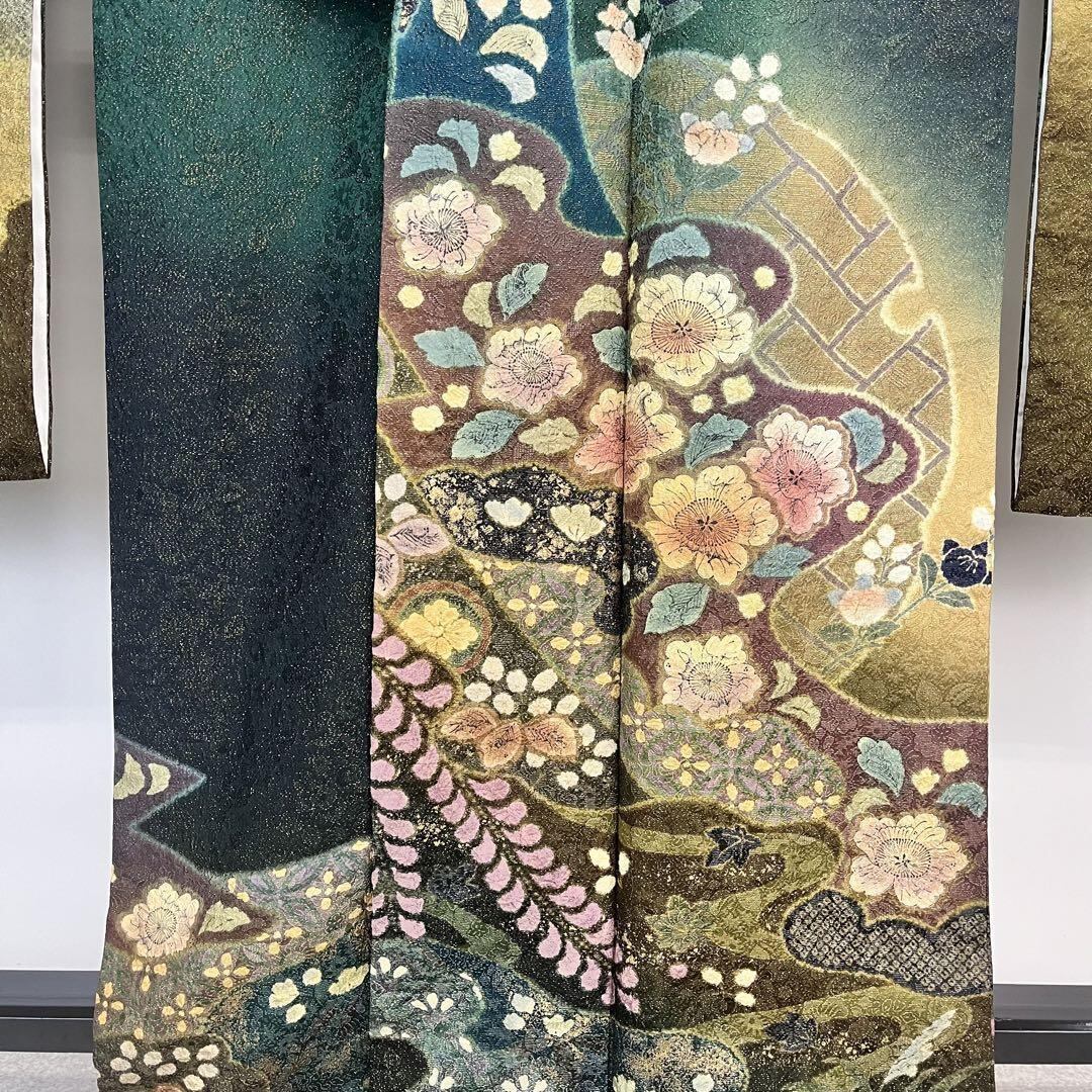 金通しされた海松藍色の高級感のあるお色味、暈し、金彩が使われた一廉辻が花と名高い美しい辻が花絞りの柄裄が素敵なお品でございます。