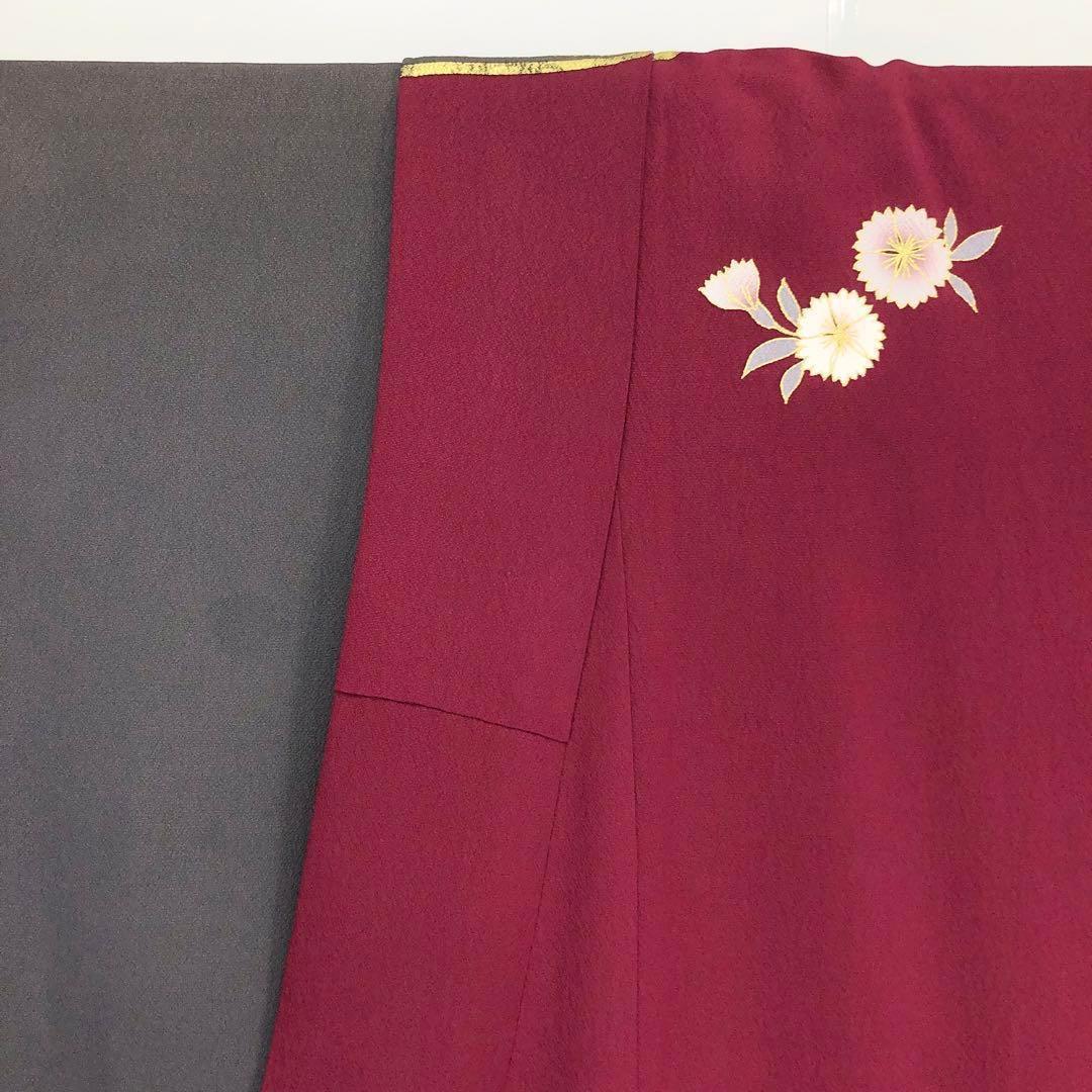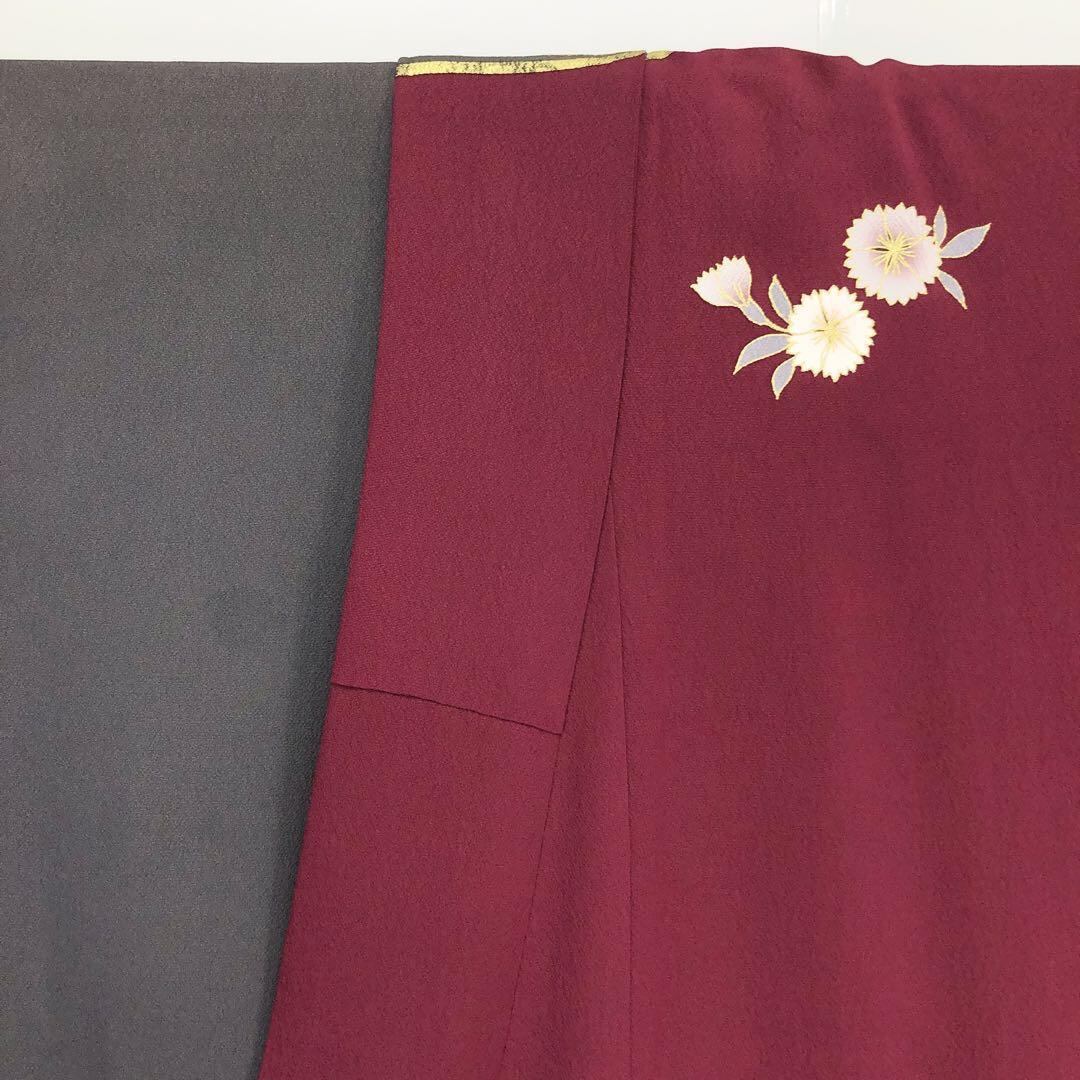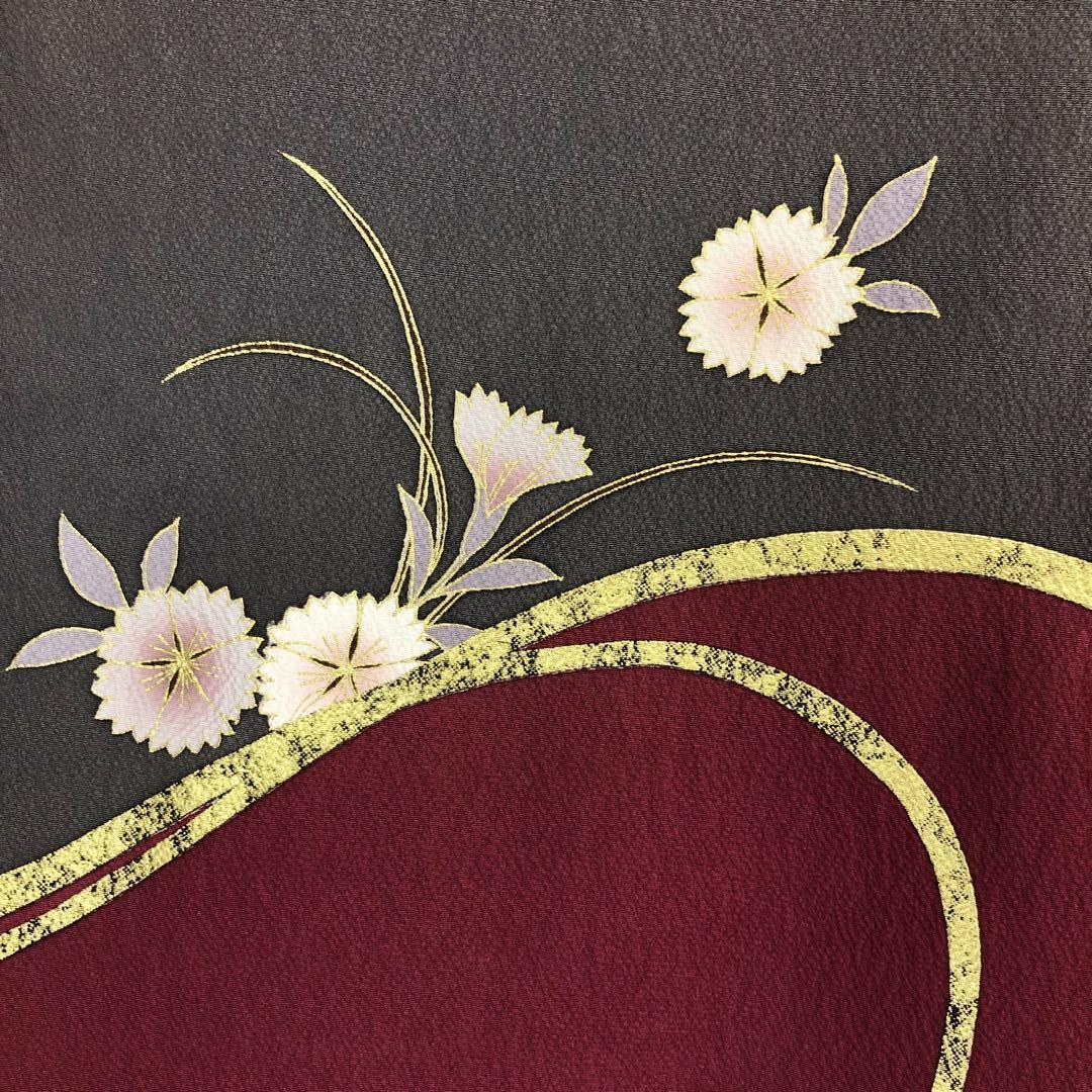 二色の落ち着いた色彩のお色味に金駒刺繍が使われた上品な花模様、大人の雰囲気の漂う素敵な柄裄がデザインされたお品でございます。