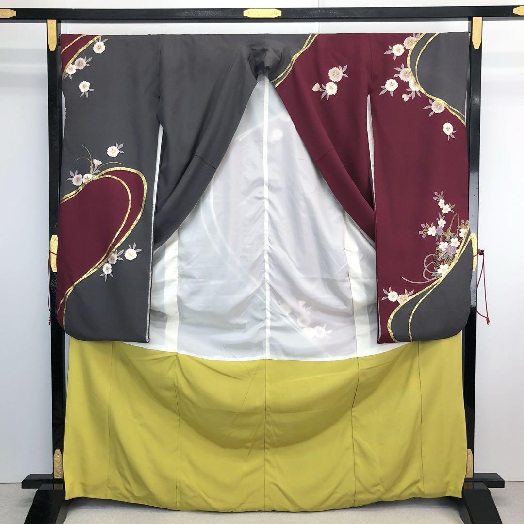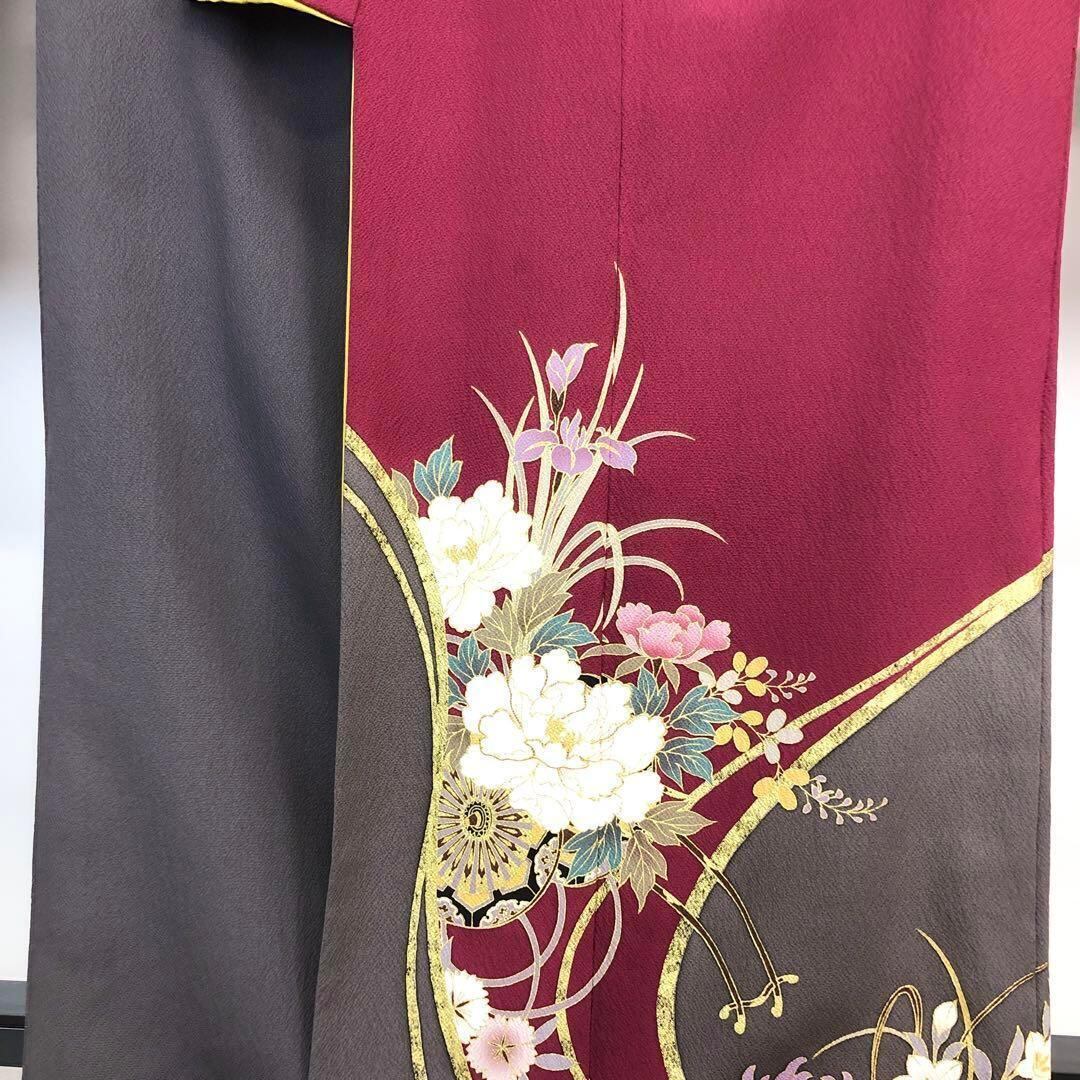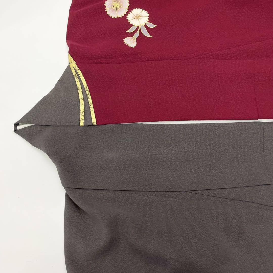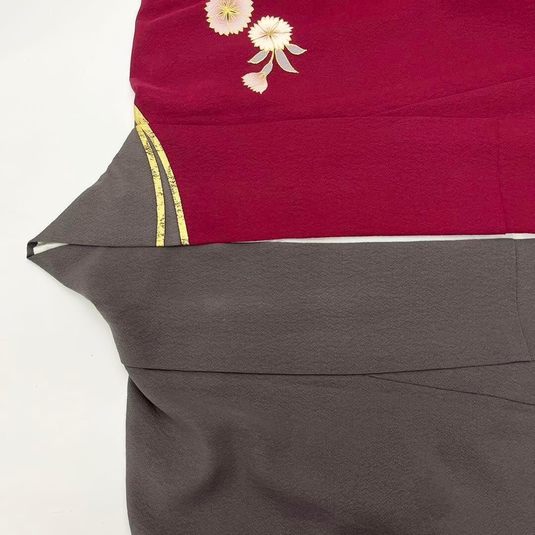 二色の落ち着いた色彩のお色味に金駒刺繍が使われた上品な花模様、大人の雰囲気の漂う素敵な柄裄がデザインされたお品でございます。
