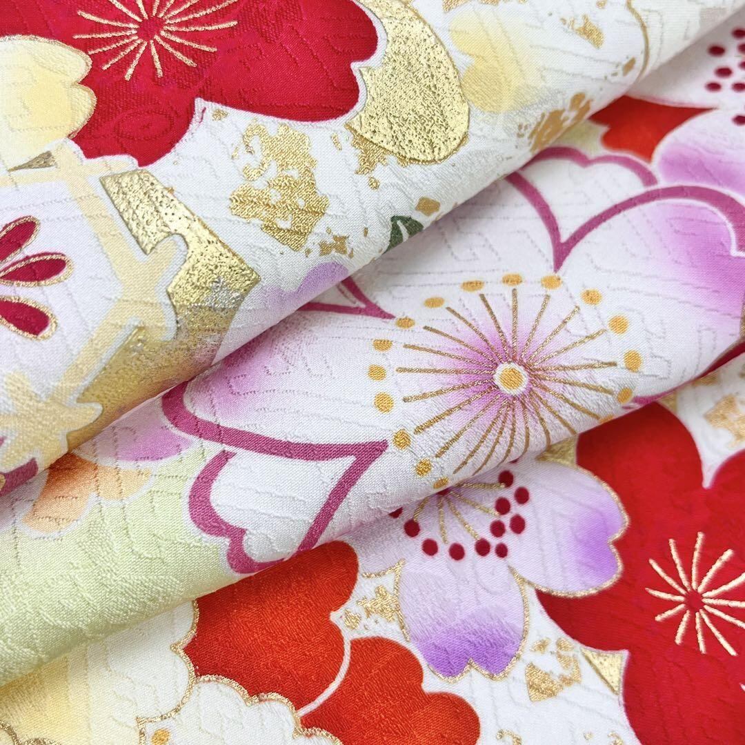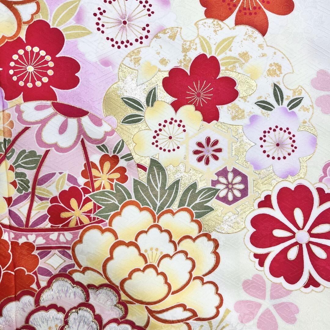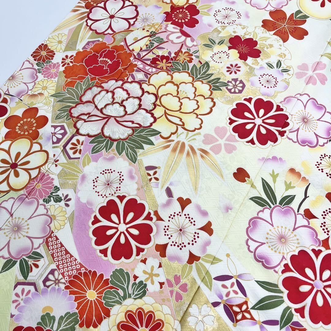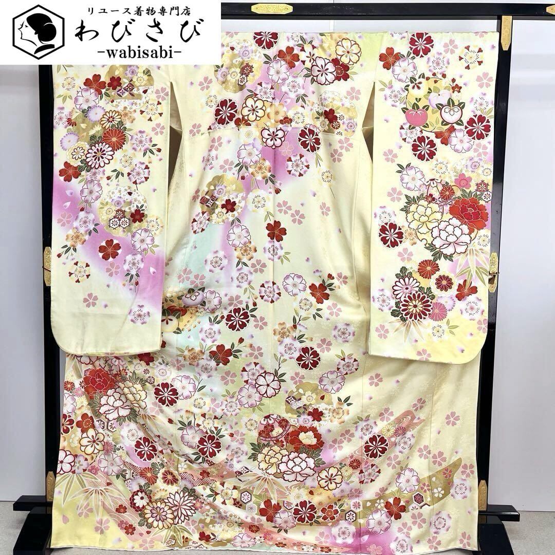 振袖 華やかな色彩 花模様 雪輪に鞠 刺繍 薄黄蘗色 トールサイズ K-4425 着物 きもの kimono 和服 和装 中古 リサイクル着物 【送料無料】
