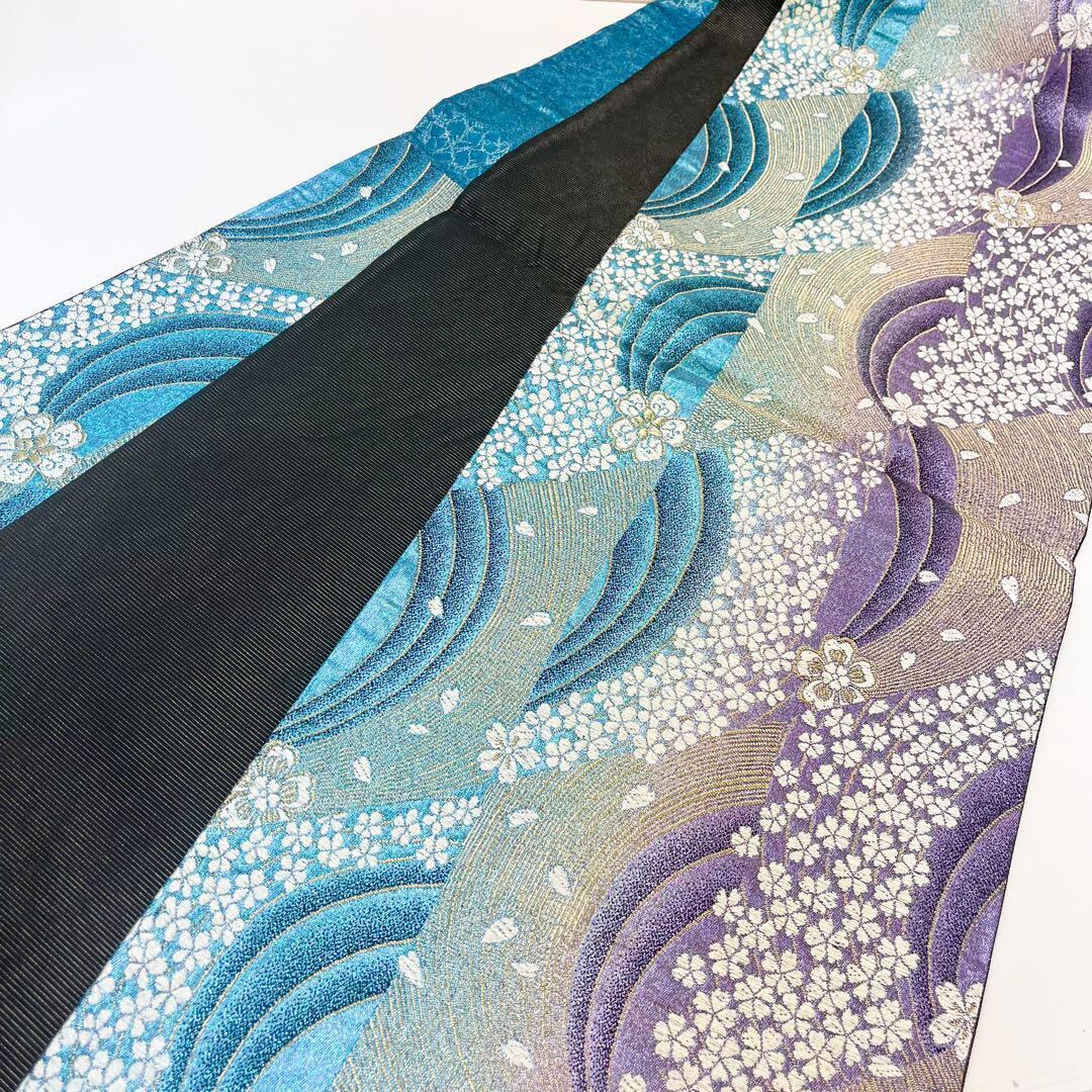 水色と紫色の煌びやかなグラデーションが美しい、流れるような桜の花模様の柄裄がデザインされた素敵なお品でございます。