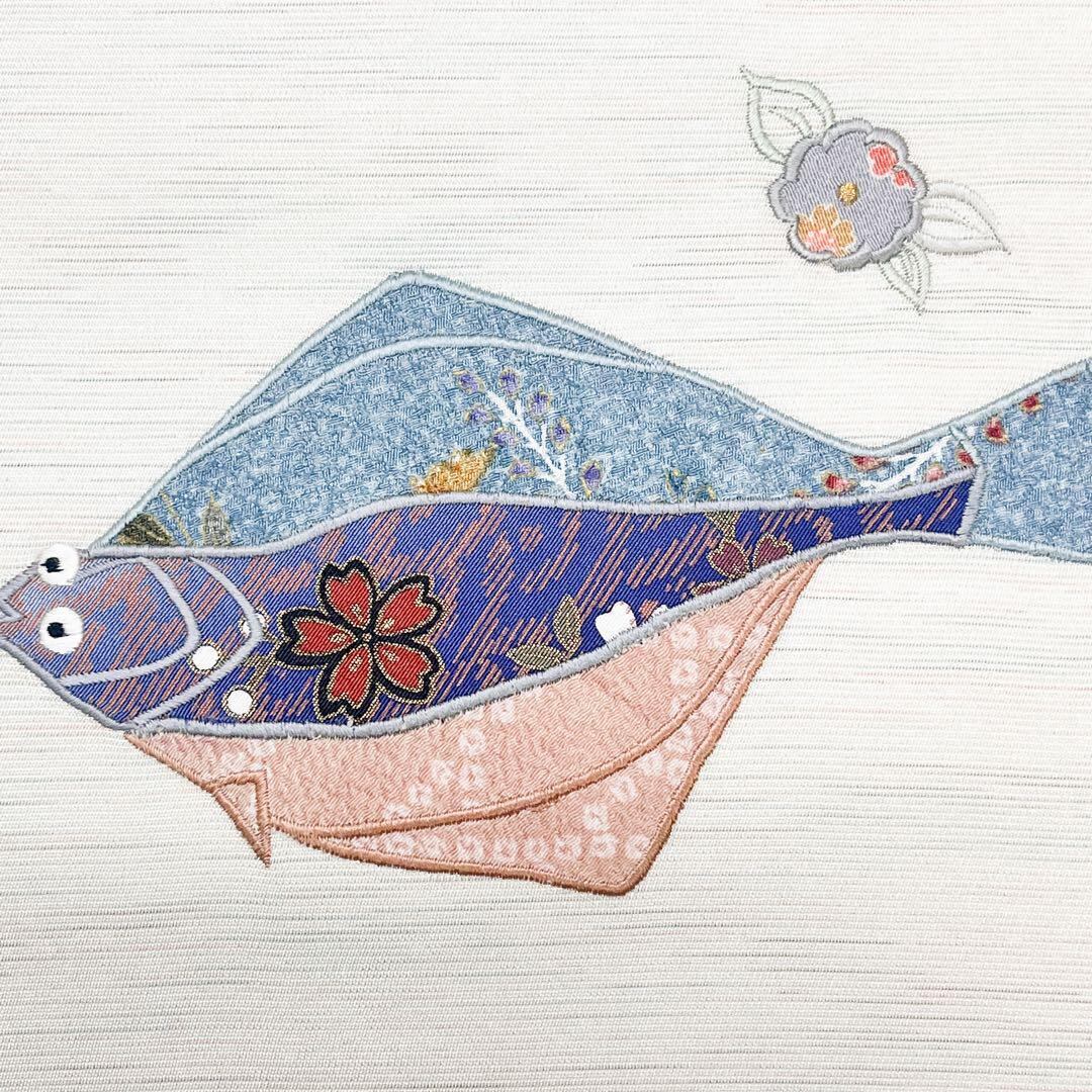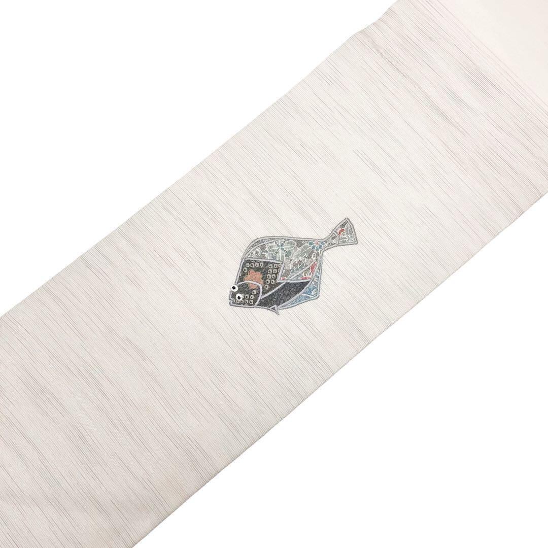 乳白色の上品なお色味に刺繍のヒラメ、魚の柄裄がデザインされた素敵なお品でございます。