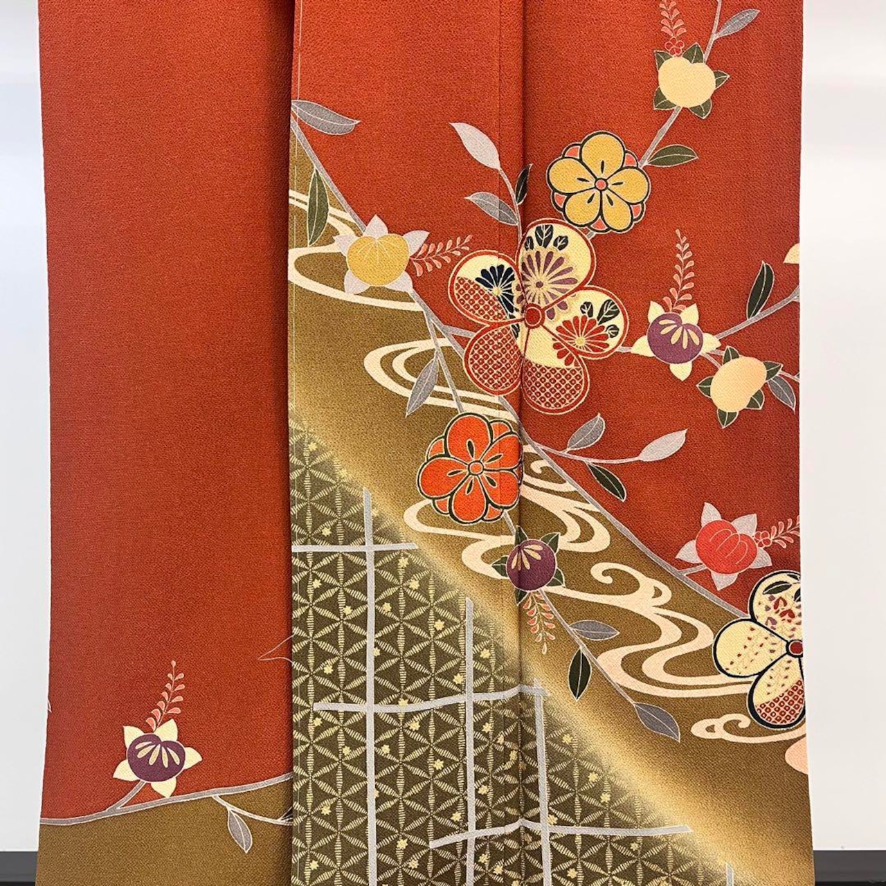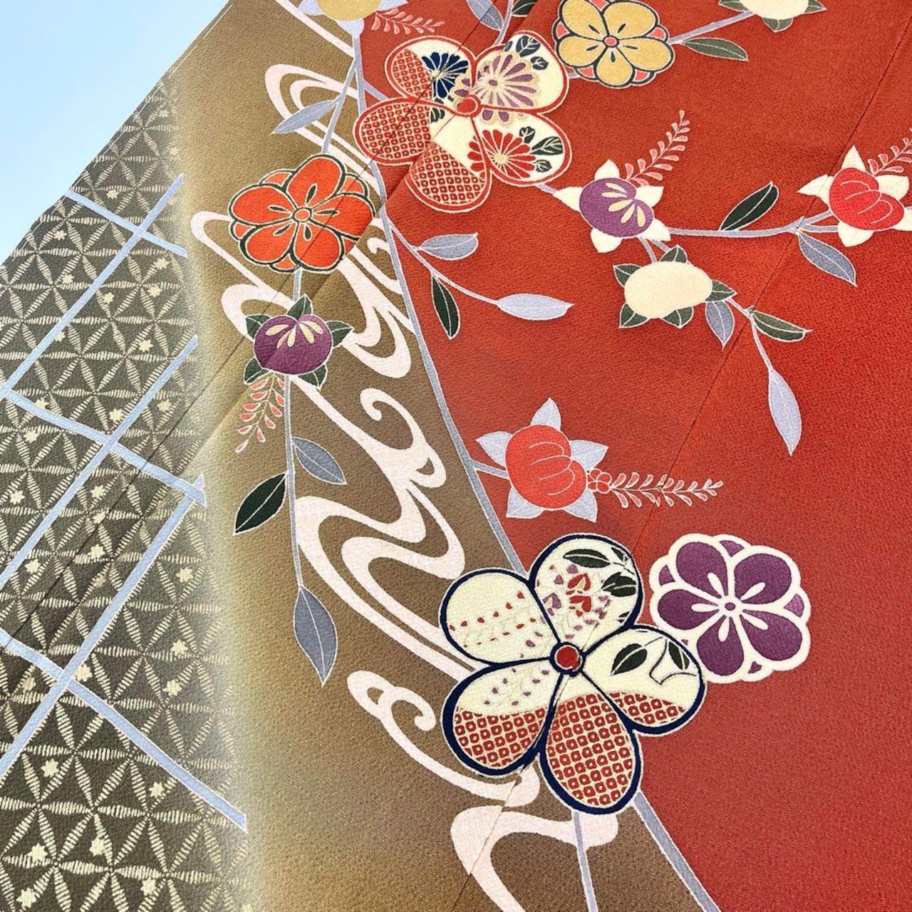 赤茶色ベースの鮮やかなお色味に染め分けの縮緬、流水に花模様の柄裄がデザインされた雰囲気の良い素敵なお品でございます。