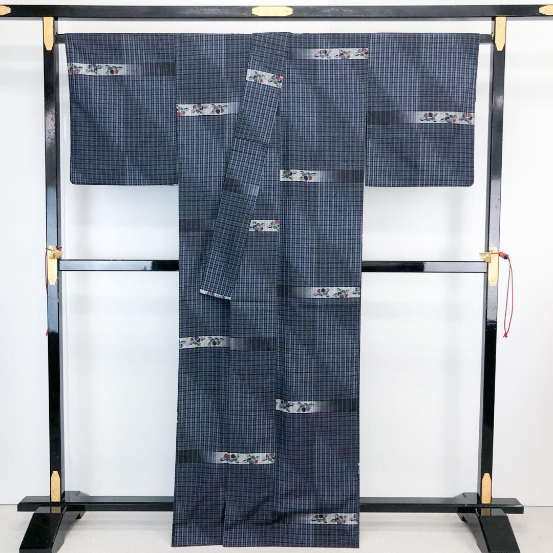 葡萄鼠色ベースのお色味のチェック柄、四角に花模様がデザインされた素敵な柄裄のお品でございます。
