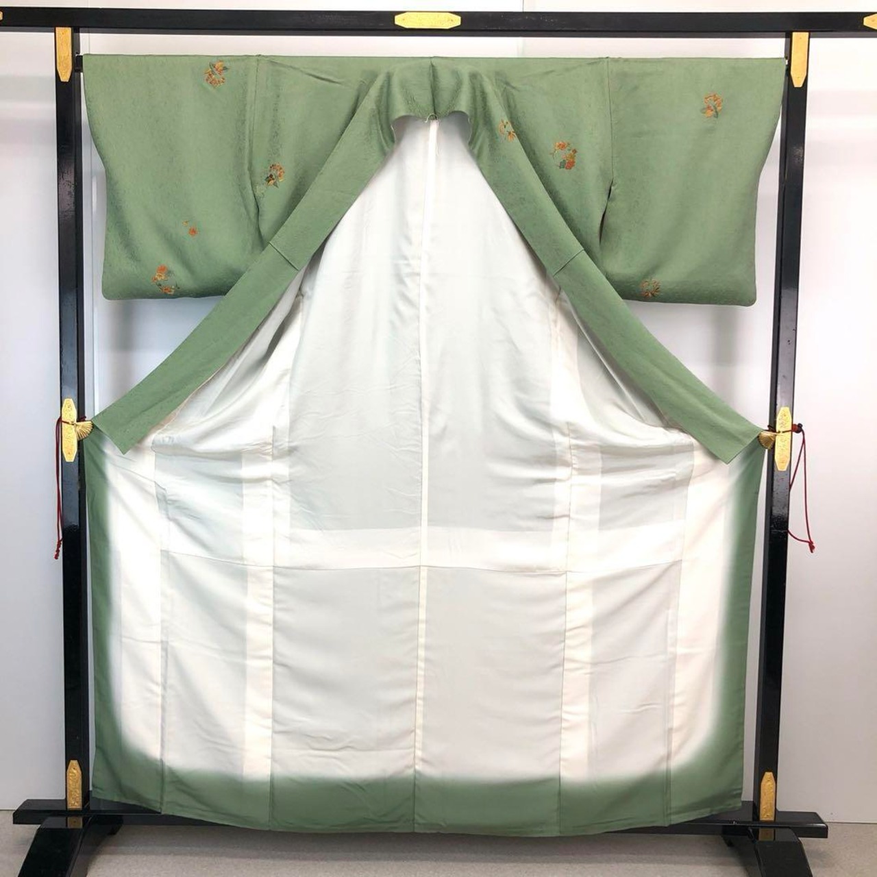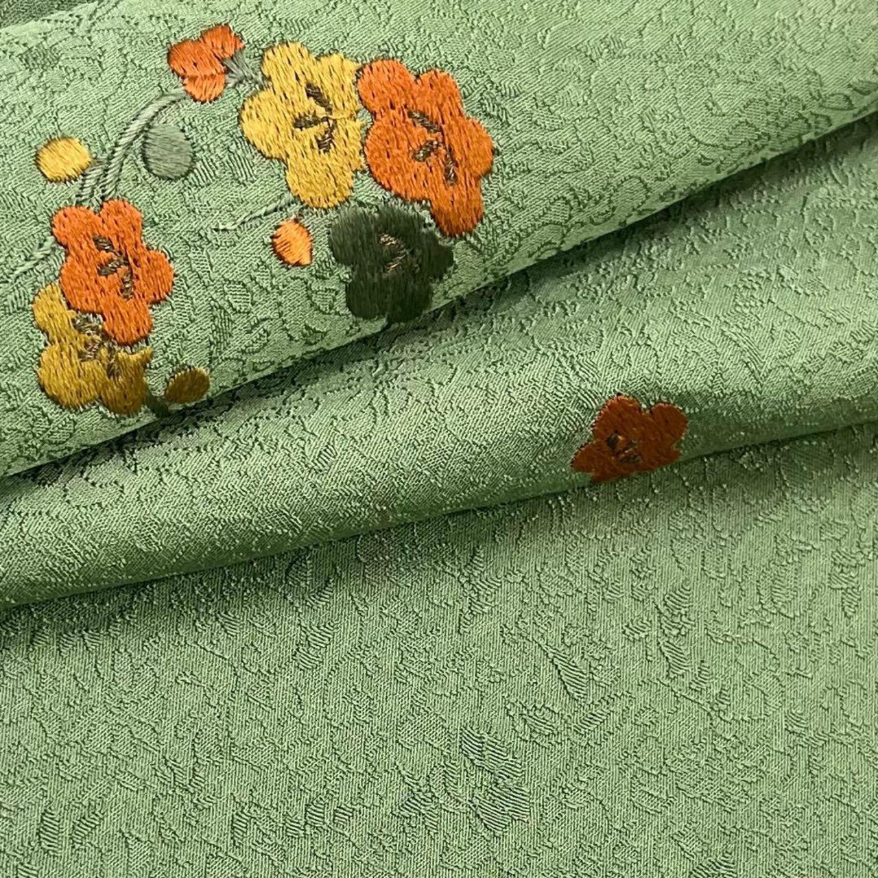 松葉色のお色味に地模様、飛び柄刺繍の花模様がデザインされた素敵な柄裄のお品でございます。