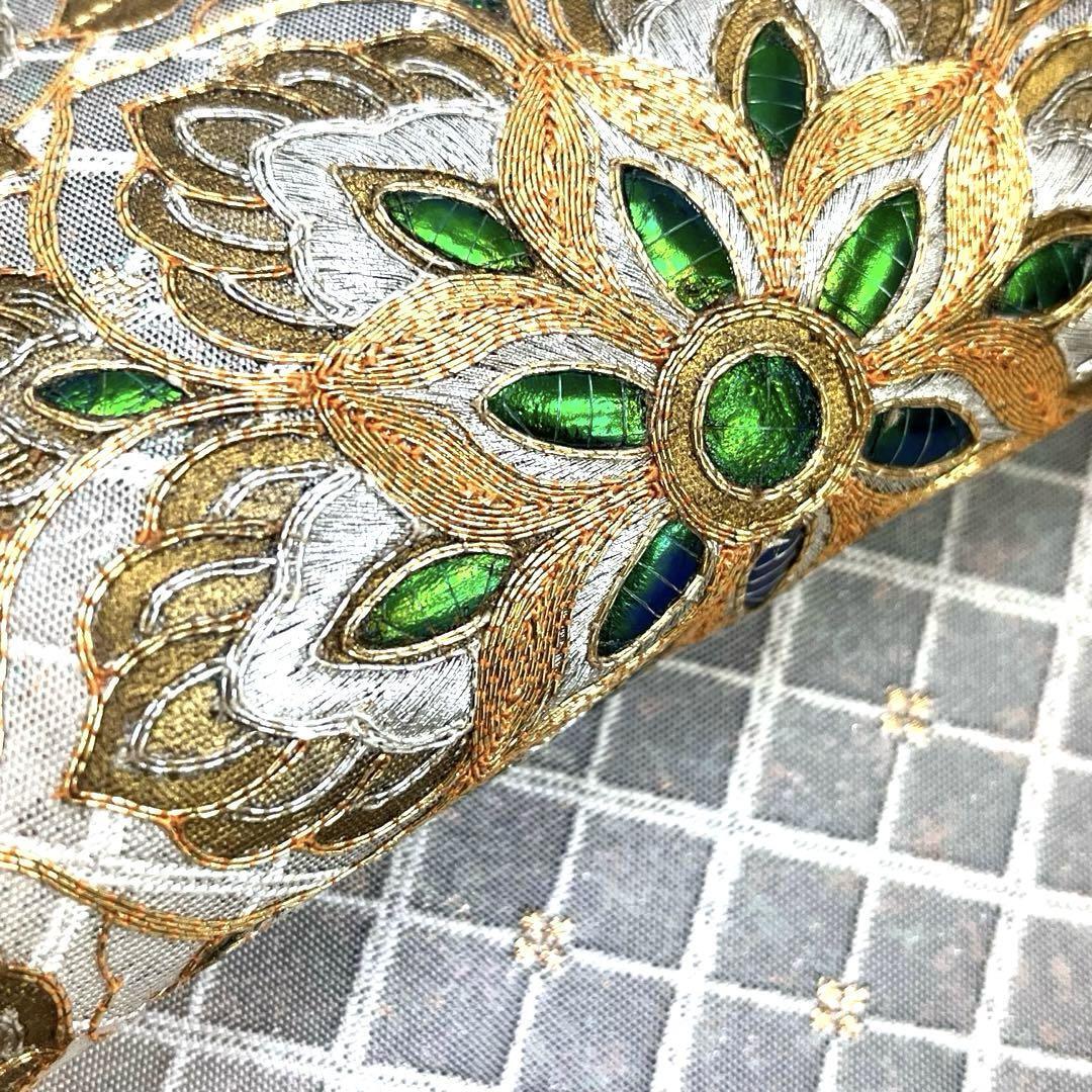 象牙色ベースの上品なお色味に玉虫の独自の輝きが際立つ美しい華柄模様がデザインされた素敵なお品でございます。