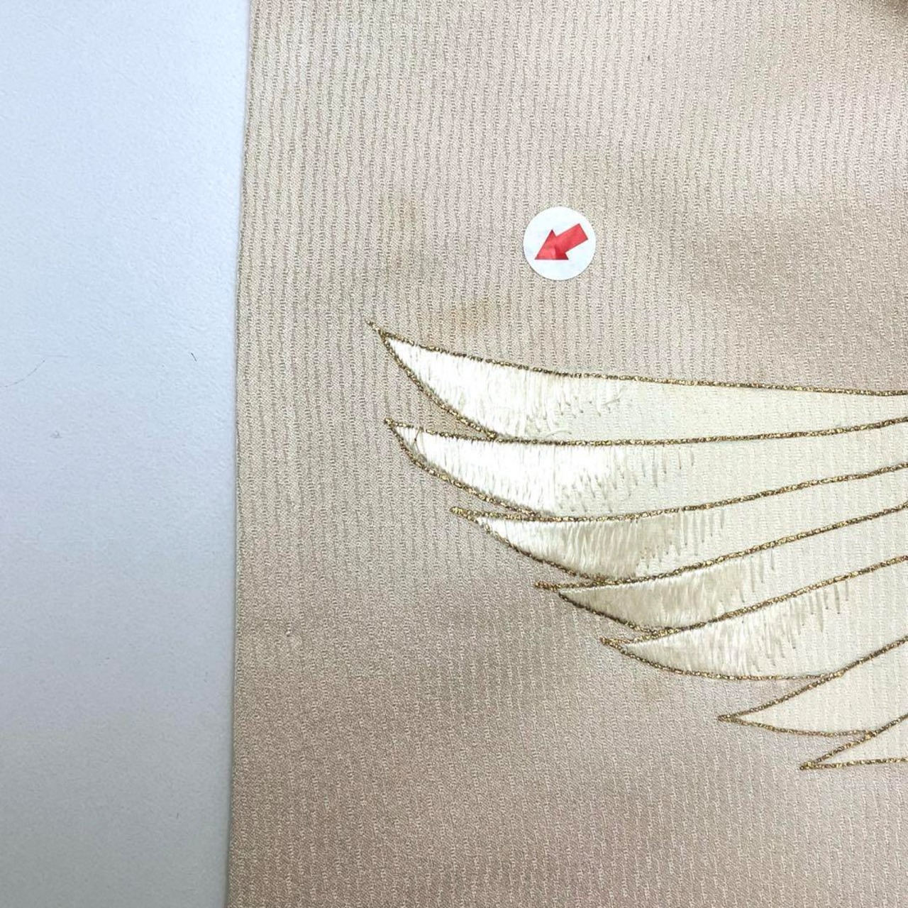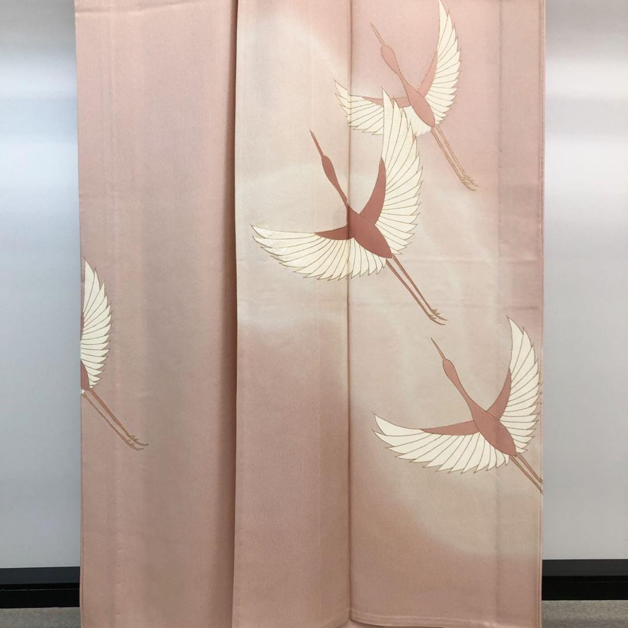 退紅色のお色味に暈し、刺繍が使われた飛翔鶴の柄裄がデザインされた素敵なお品でございます。