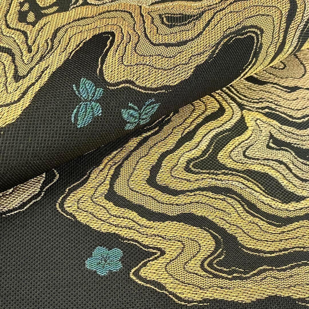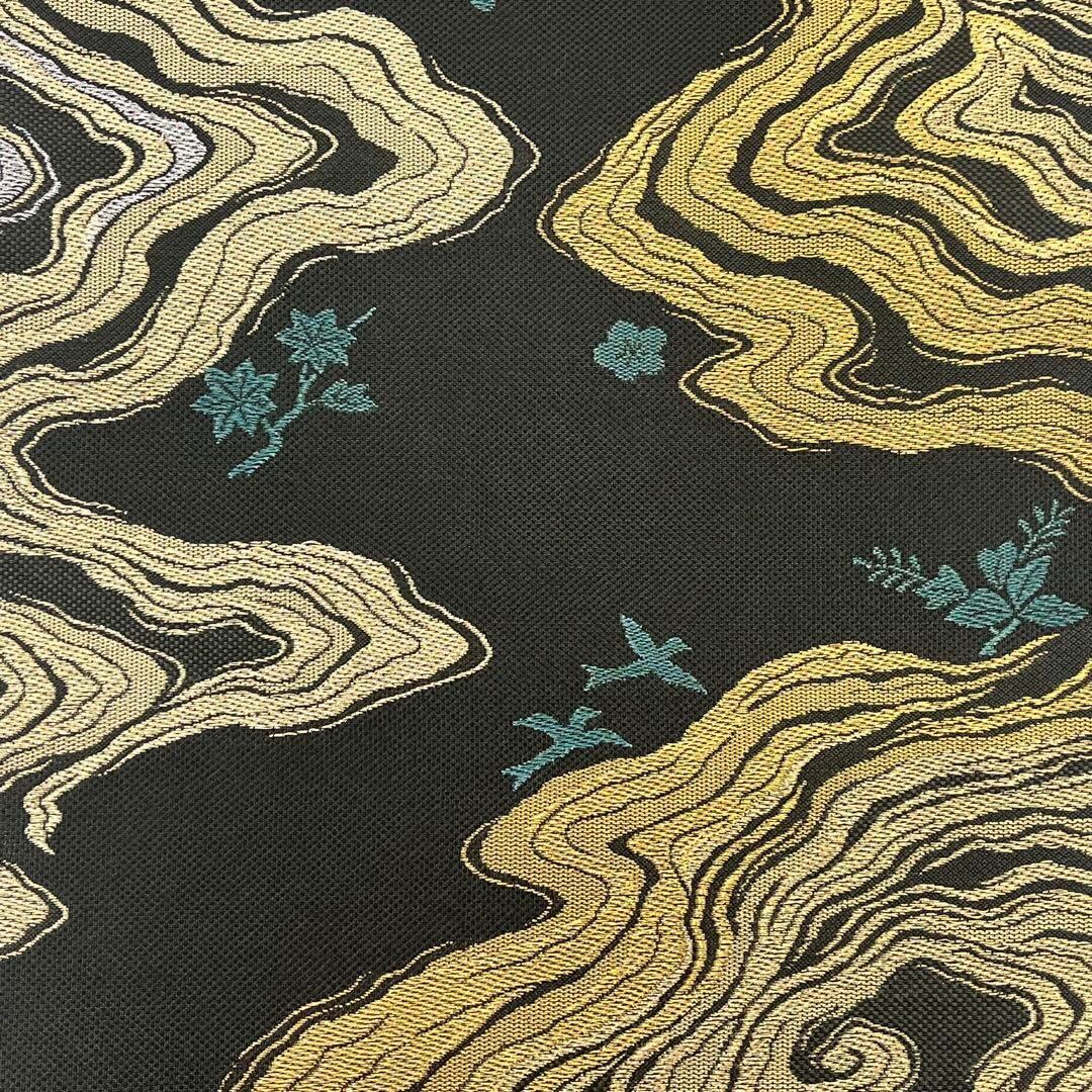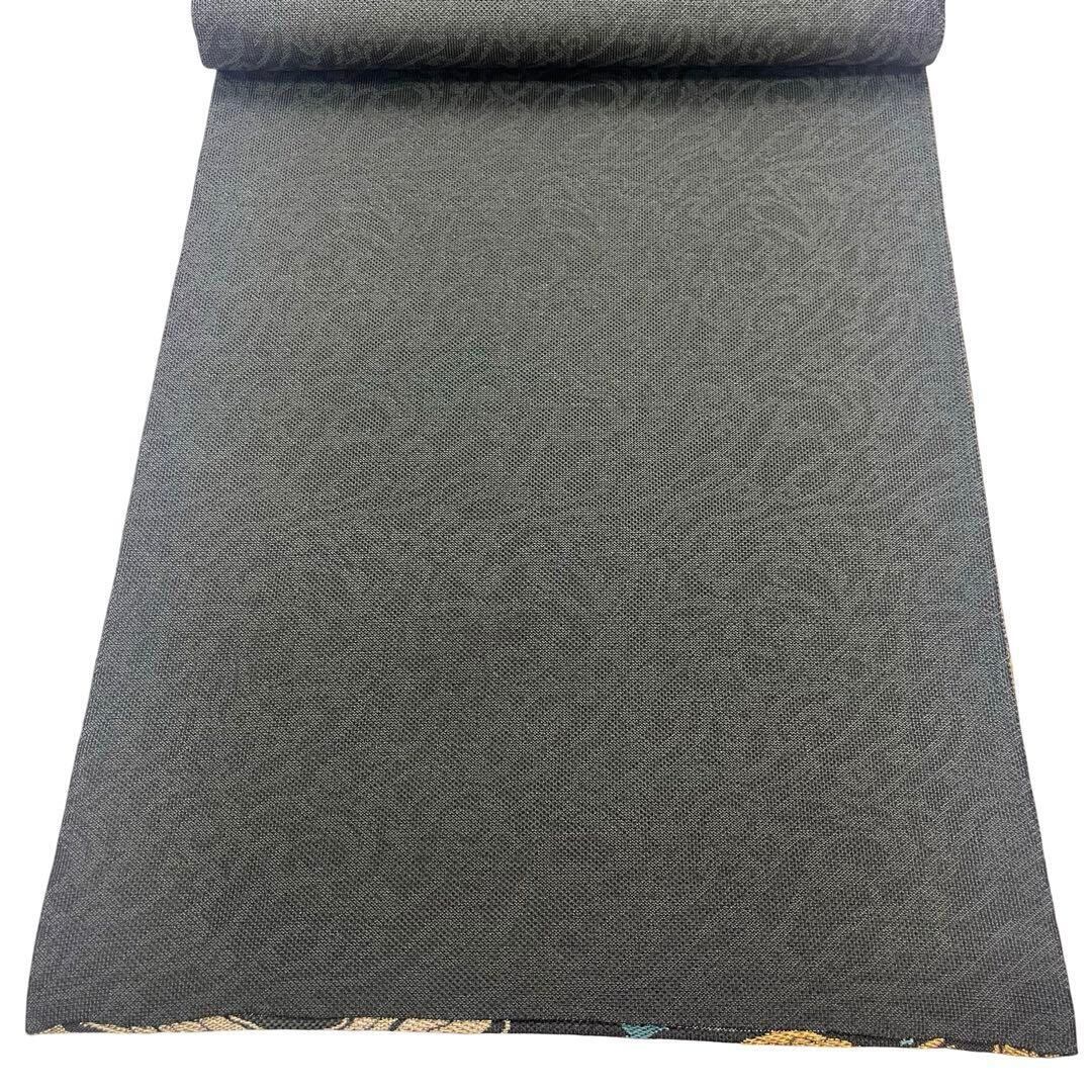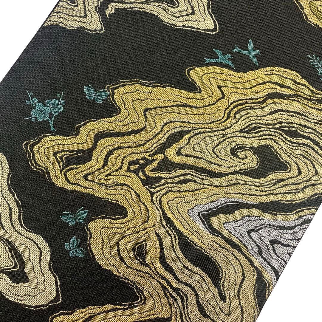 濡羽色の落ち着きのあるお色味にモダンな雰囲気の霞模様、鳥、蝶々、梅の柄裄がデザインされた素敵なお品でございます。