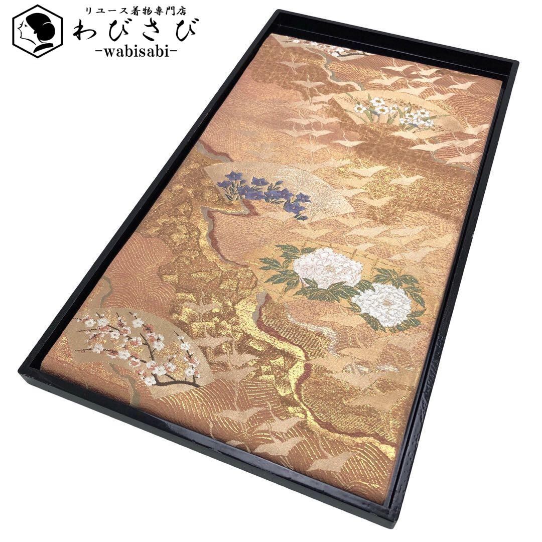 袋帯 西陣 聚楽 草花扇面図 扇に草花模様 飛翔鶴 金糸 積紅色 O-4752 着物 きもの kimono 和服 和装 中古 リサイクル着物 【送料無料】