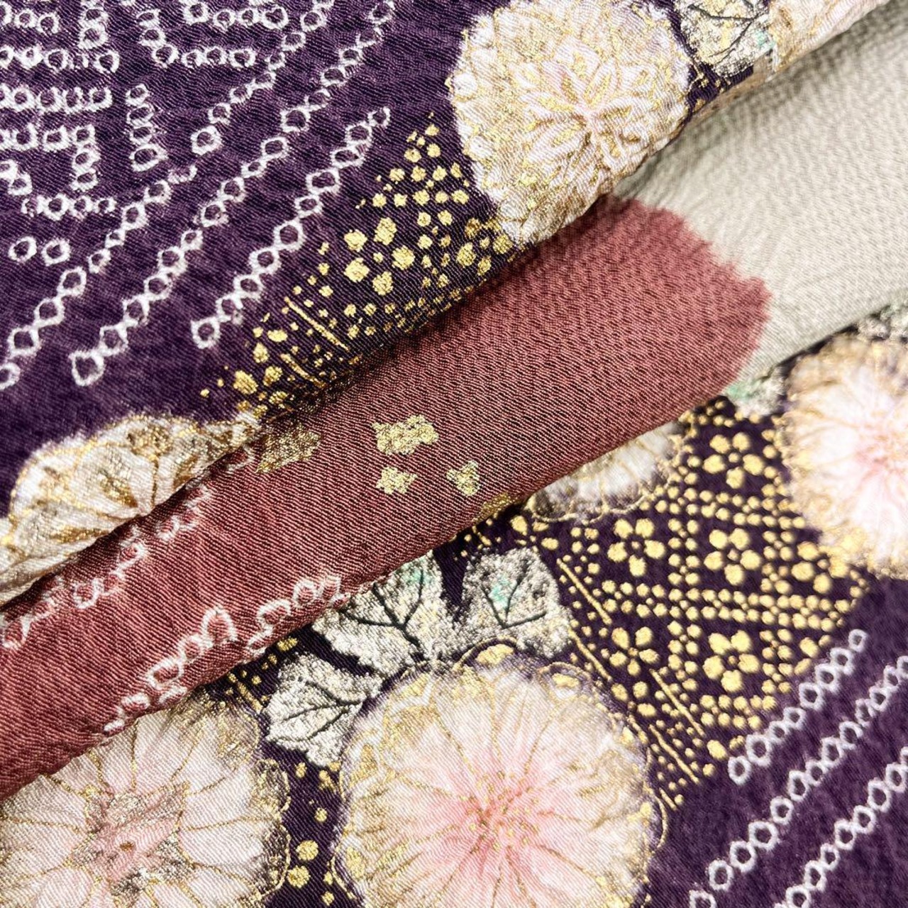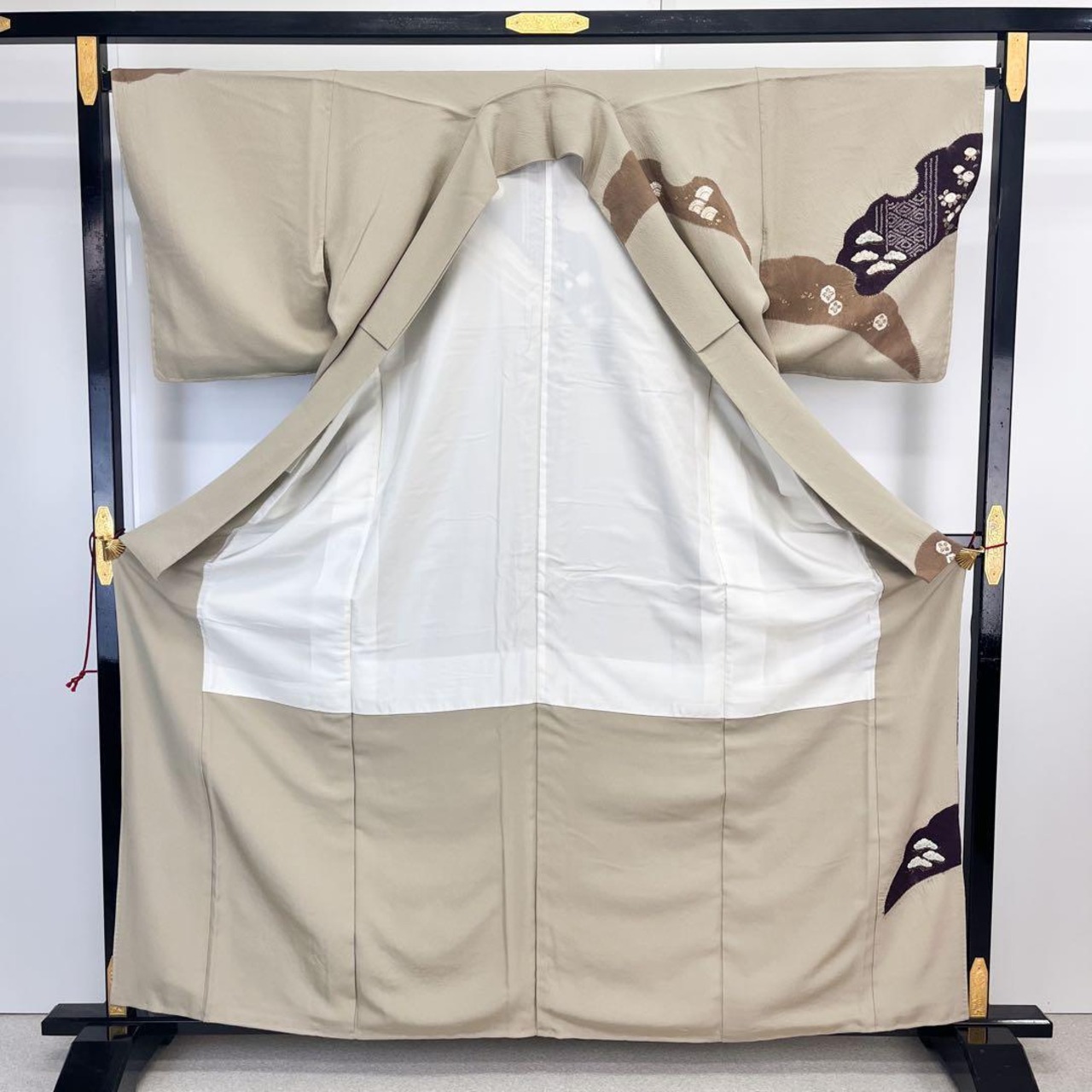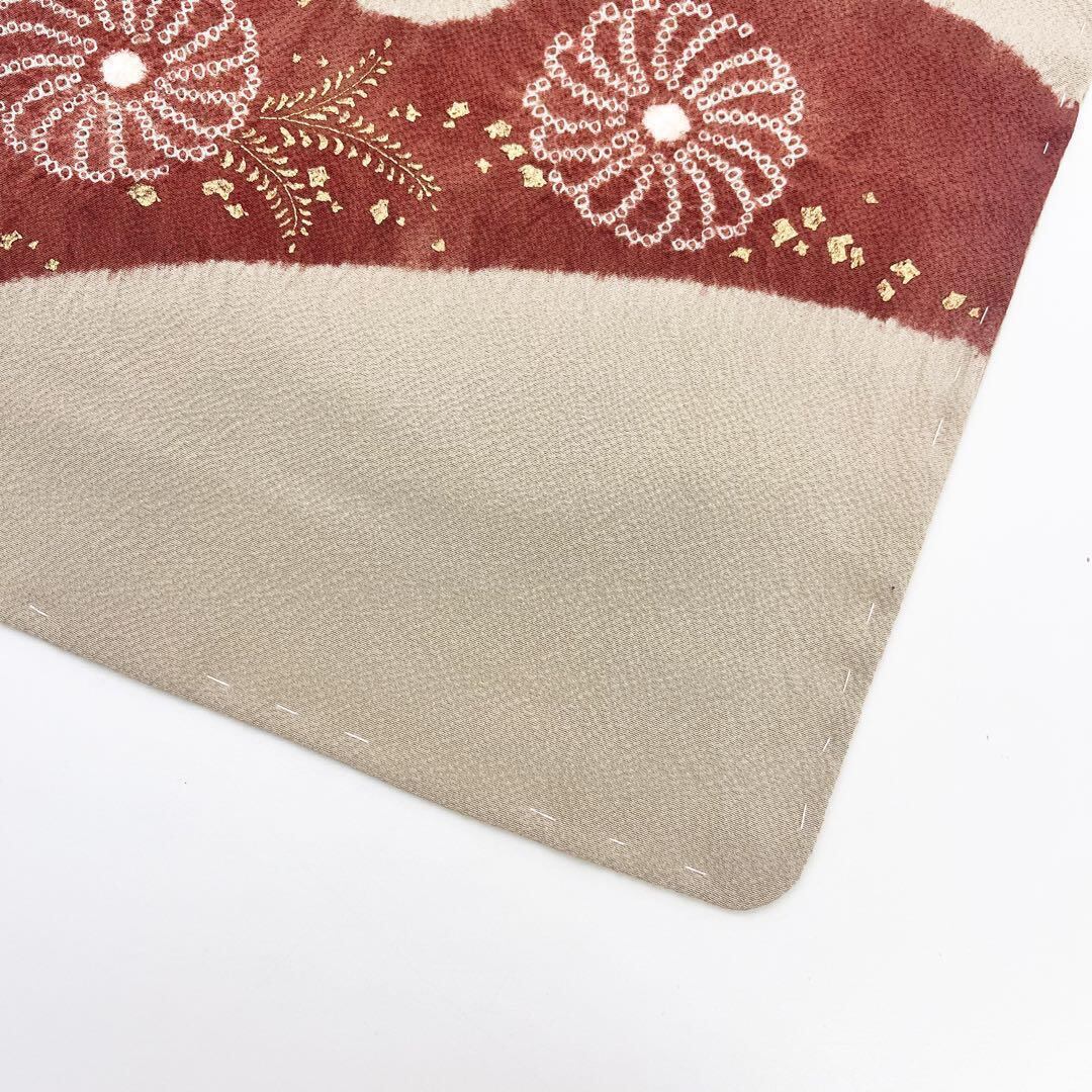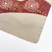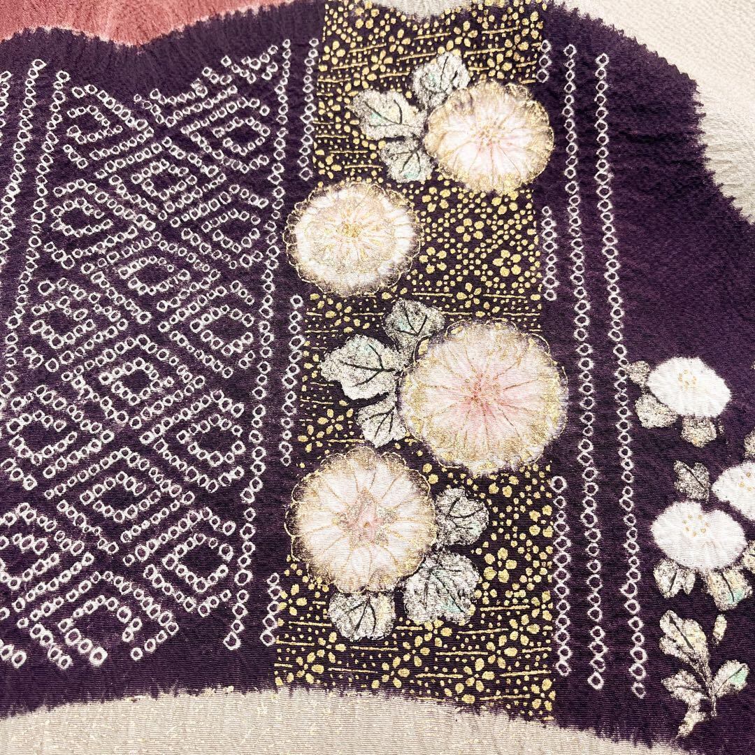 白橡色の上品なお色味の縮緬に雪芝に辻が花絞り、松などの雰囲気の良い絞り柄がデザインされた素敵なお品でございます。