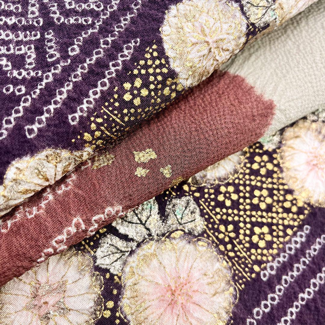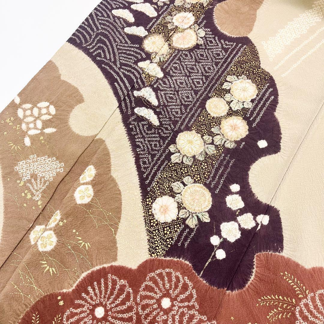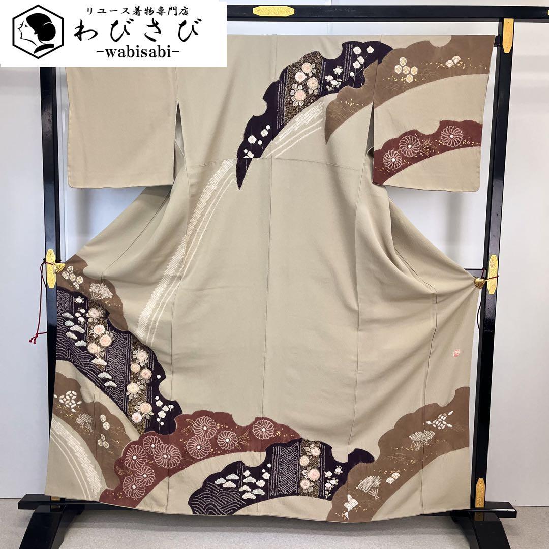 訪問着 十日町 滝泰 雪輪に辻が花絞り 白橡色 縮緬 K-4439 着物 きもの kimono 和服 和装 中古 リサイクル着物 【送料無料】