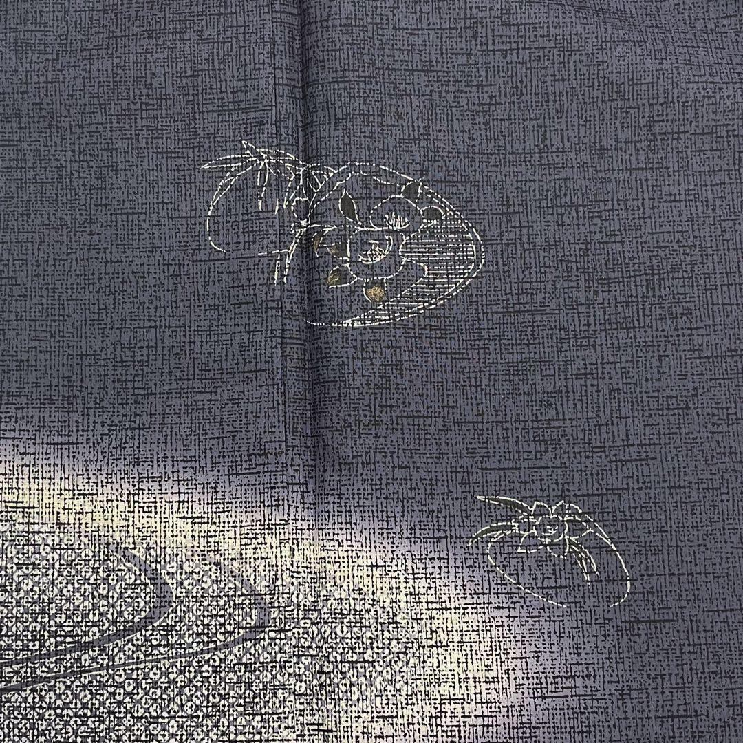 青紫色ベースのお色味暈し、流水に草花模様の柄裄がデザインされた品の良い素敵なお品でございます。