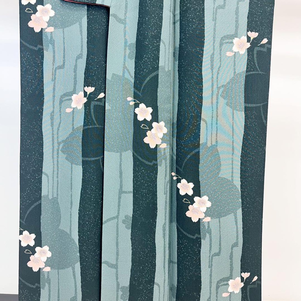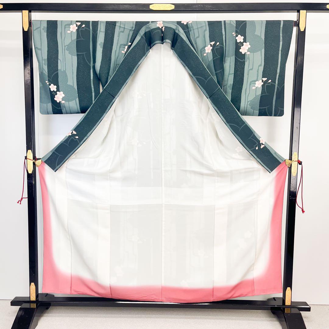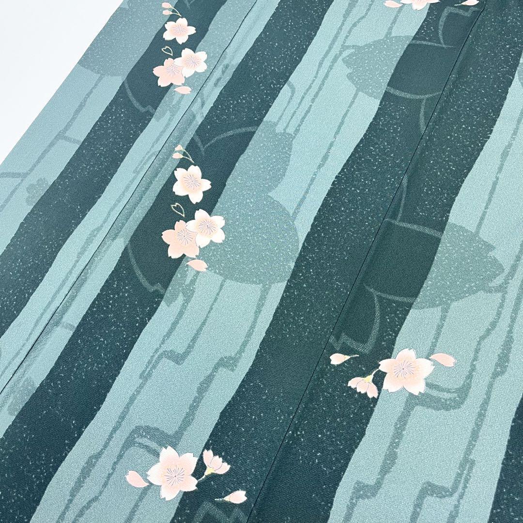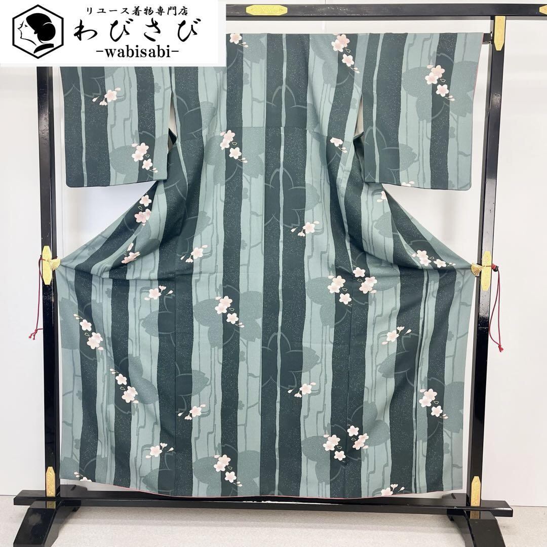 千草色ベースのお色味の縮緬に縦縞に桜の花模様がデザインされた素敵な柄裄のお品でございます。