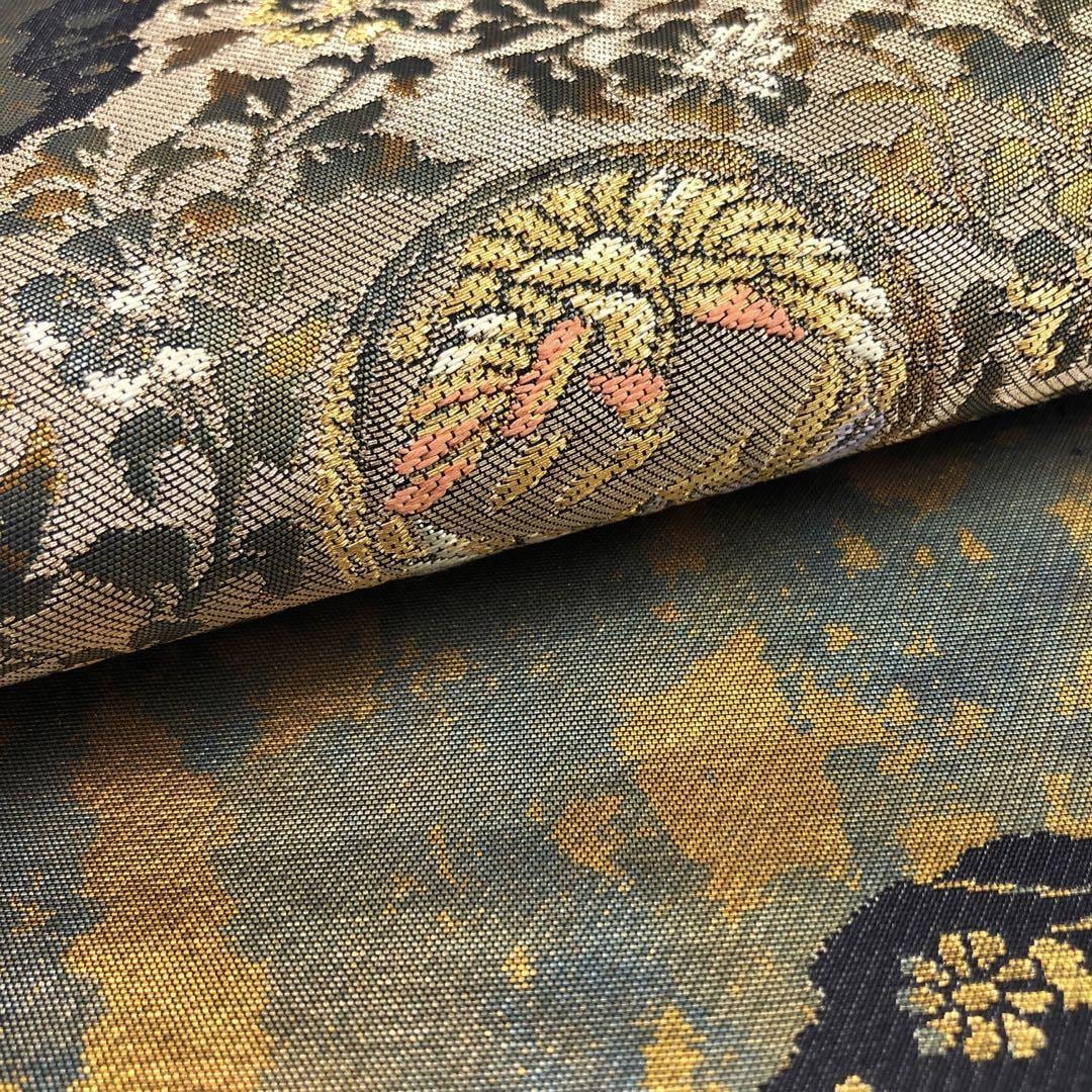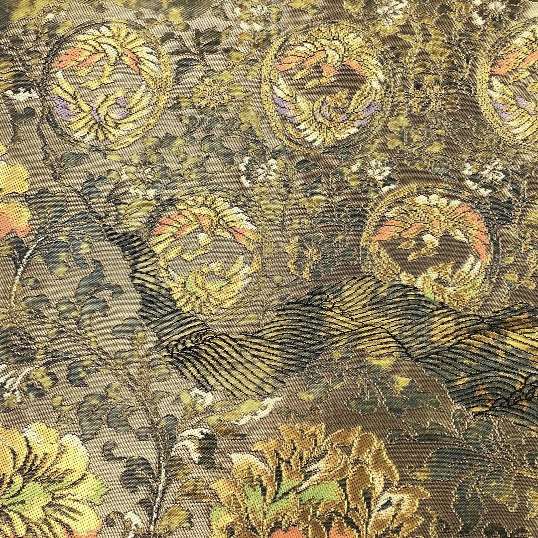 こはく錦、煌びやかな花唐草模様、丸に向かい鳥の柄裄がデザインされた素敵なお品でございます。