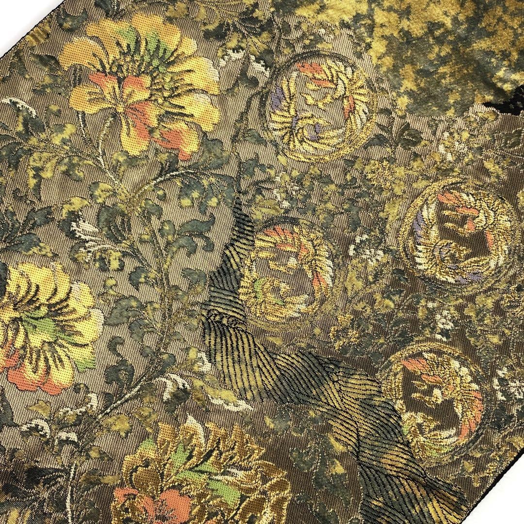 袋帯 西陣 服部織物 こはく錦 手工芸 花唐草模様 丸に向かい鳥 O-4754 着物 きもの kimono 和服 和装 中古 リサイクル着物 【送料無料】