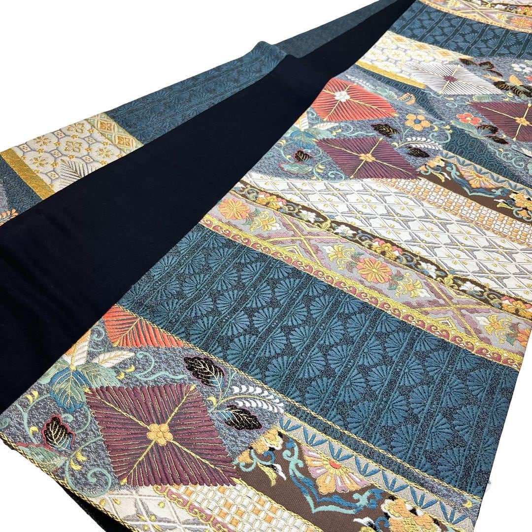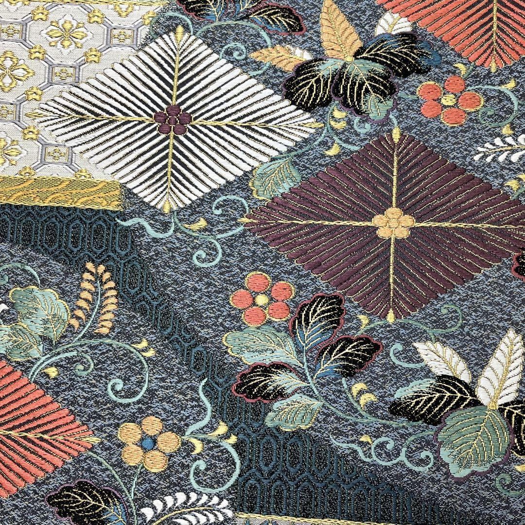深藍色ベースの多彩なお色味、松菱、花模様などの多様な柄裄がデザインされた素敵なお品でございます。
