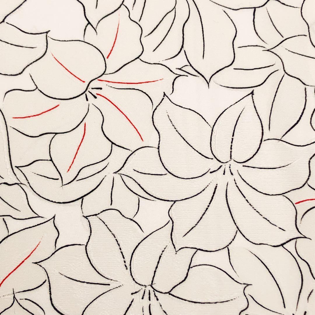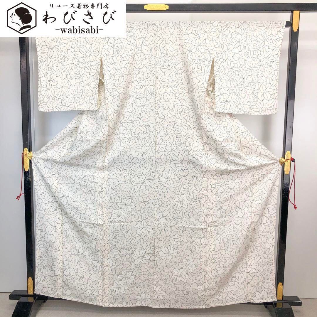 乳白色の上品なお色味に線描きの敷き詰められた花柄模様がデザインされた素敵な柄裄のお品でございます。