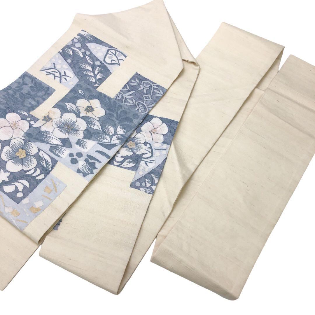 名古屋帯 特選手織 すくいおび 紬 花模様 乳白色 ガード加工 O-4763 着物 きもの kimono 和服 和装 中古 リサイクル着物 【送料無料】