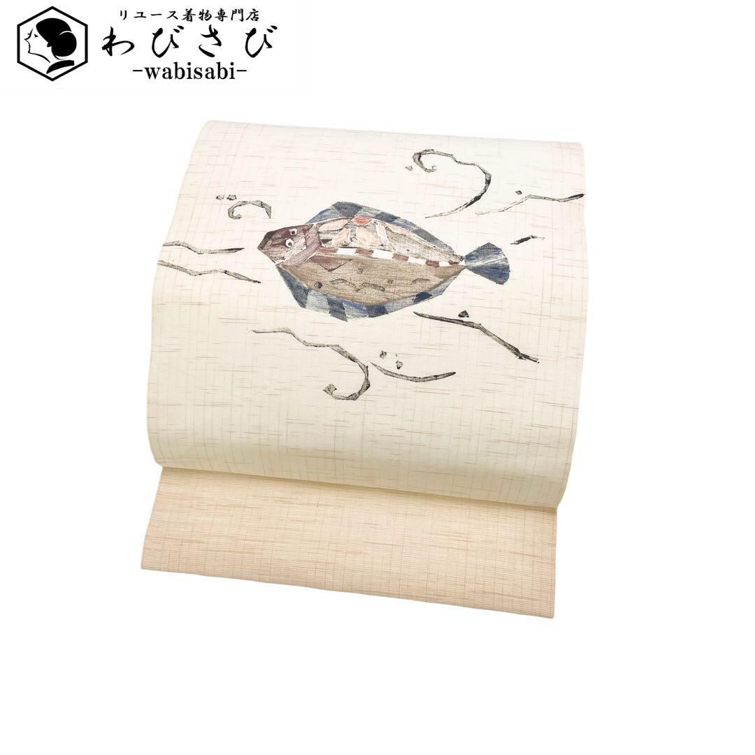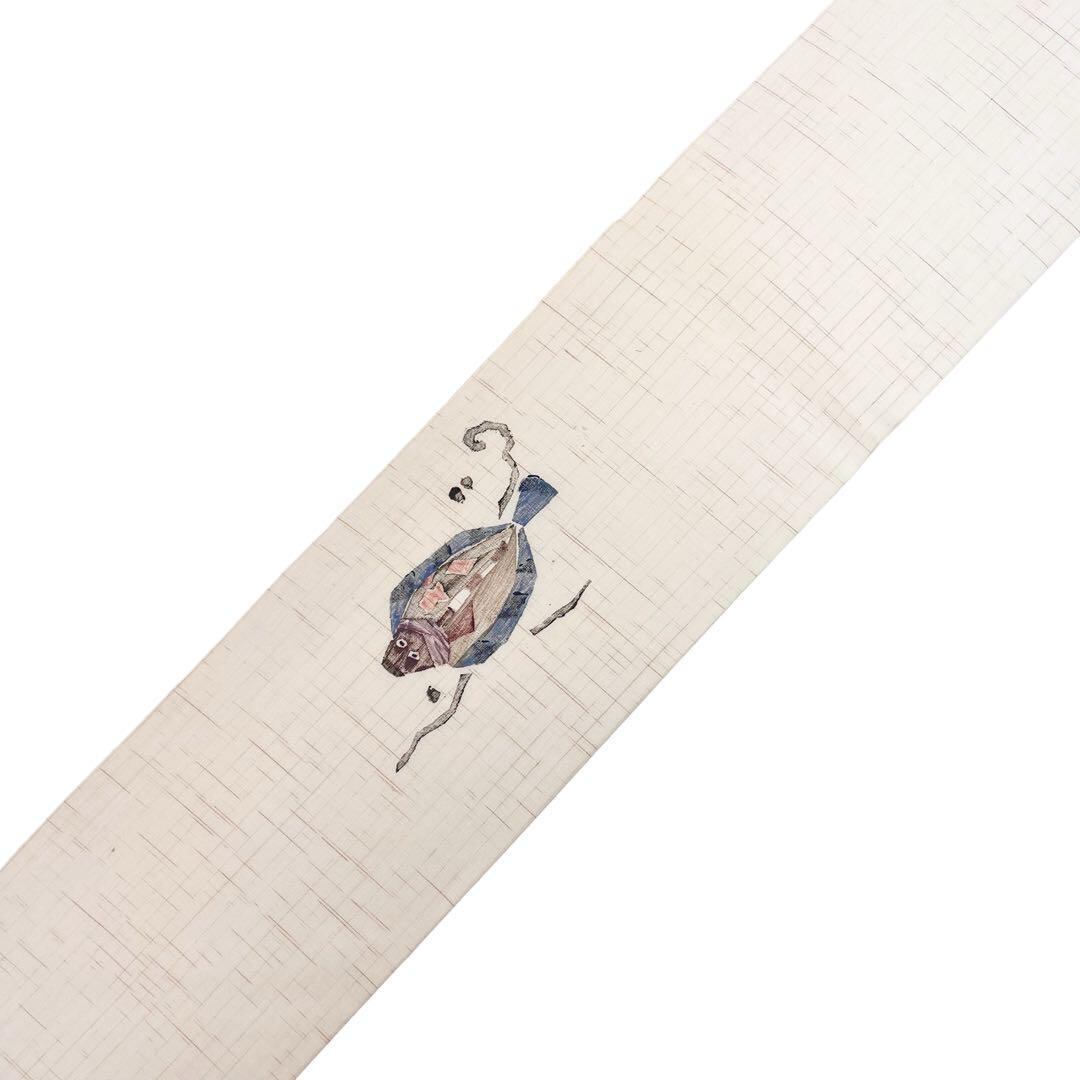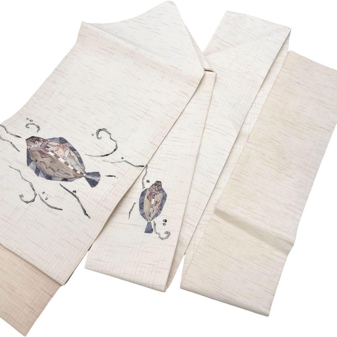 乳白色の紬地にヒラメの魚の織柄がデザインされた雰囲気の良い素敵なお品でございます。