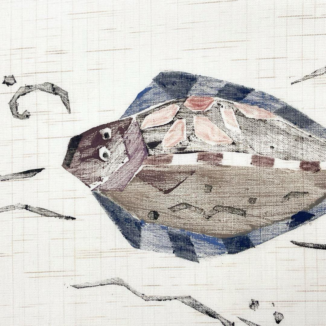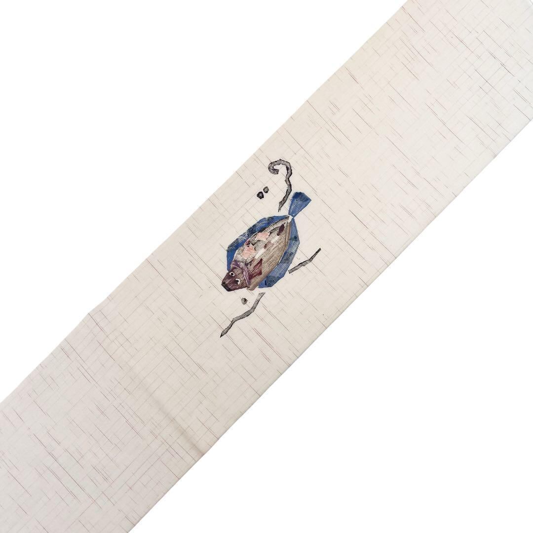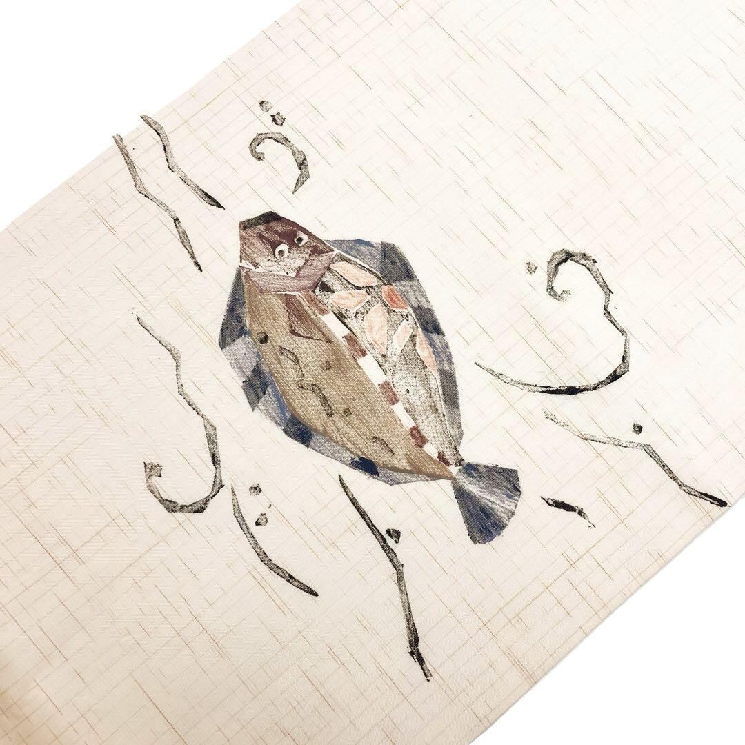 乳白色の紬地にヒラメの魚の織柄がデザインされた雰囲気の良い素敵なお品でございます。