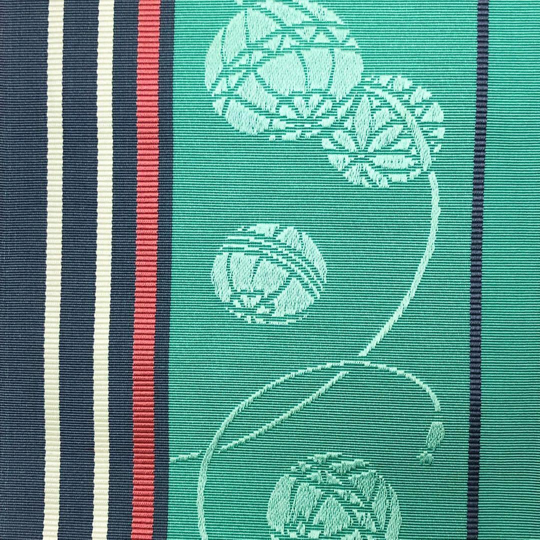 薄孔雀色緑色の雰囲気の良いお色味に縦縞や鞠の柄裄がデザインされた素敵なお品でございます。