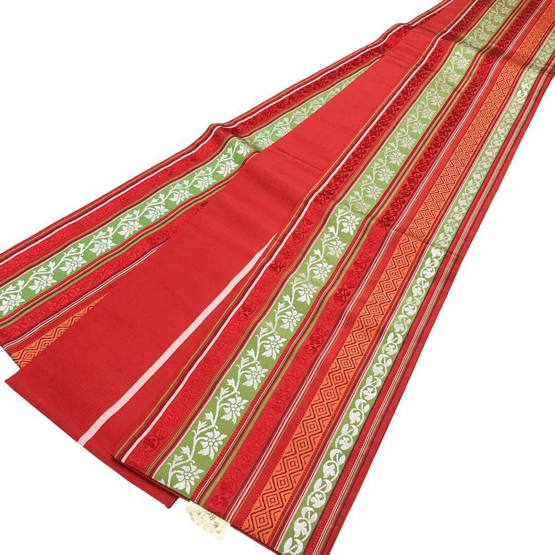 赤色のお色味に縦縞、花唐草模様の柄裄がデザインされた素敵なお品でございます。