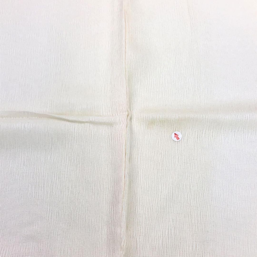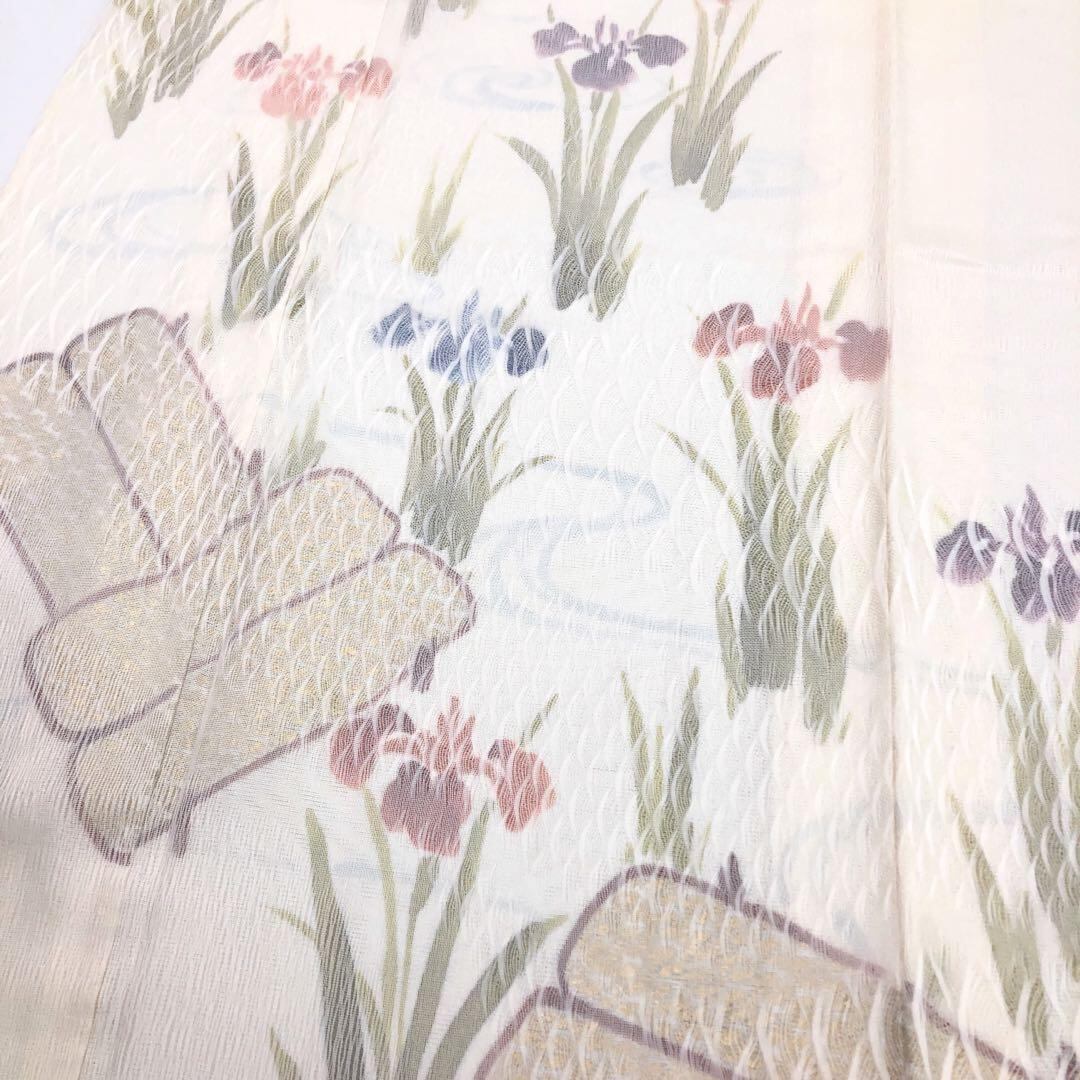 乳白色の上品なお色味、裏は絽、表は夏すくいの重なった透け感のある生地から浮き上がる菖蒲の花模様が雰囲気のある素敵な柄裄のお品でございます。