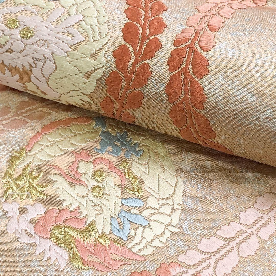 袋帯 唐織 丸の中に龍 ドラゴン 竜 立桶 金糸 薄柿色 O-4760 着物 きもの kimono 和服 和装 中古 リサイクル着物 【送料無料】