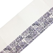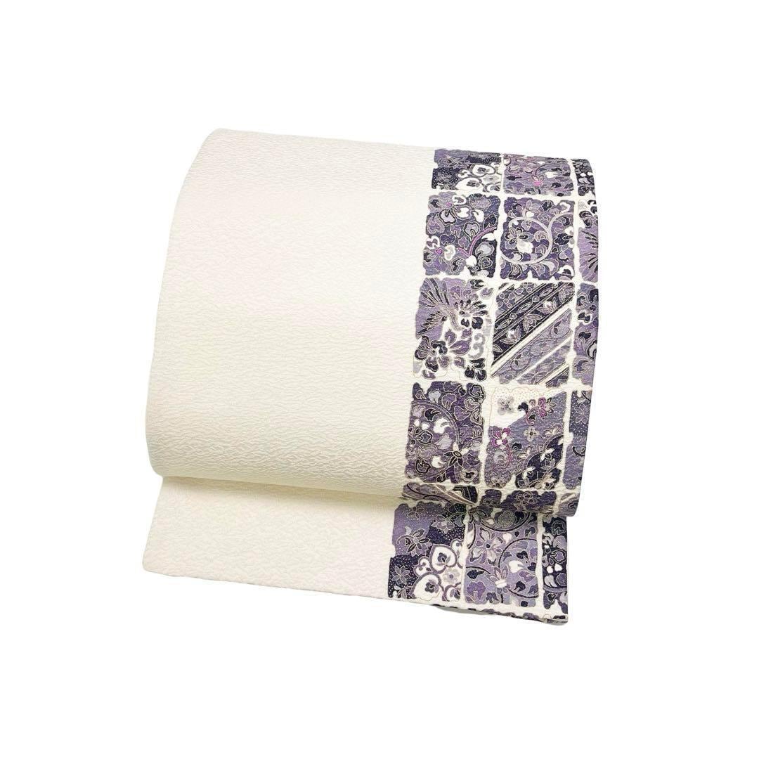 乳白色の上品なお色味に銀通し、縦柄の四角の中に花柄模様、鳥などの柄裄がデザインされた素敵なお品でございます。