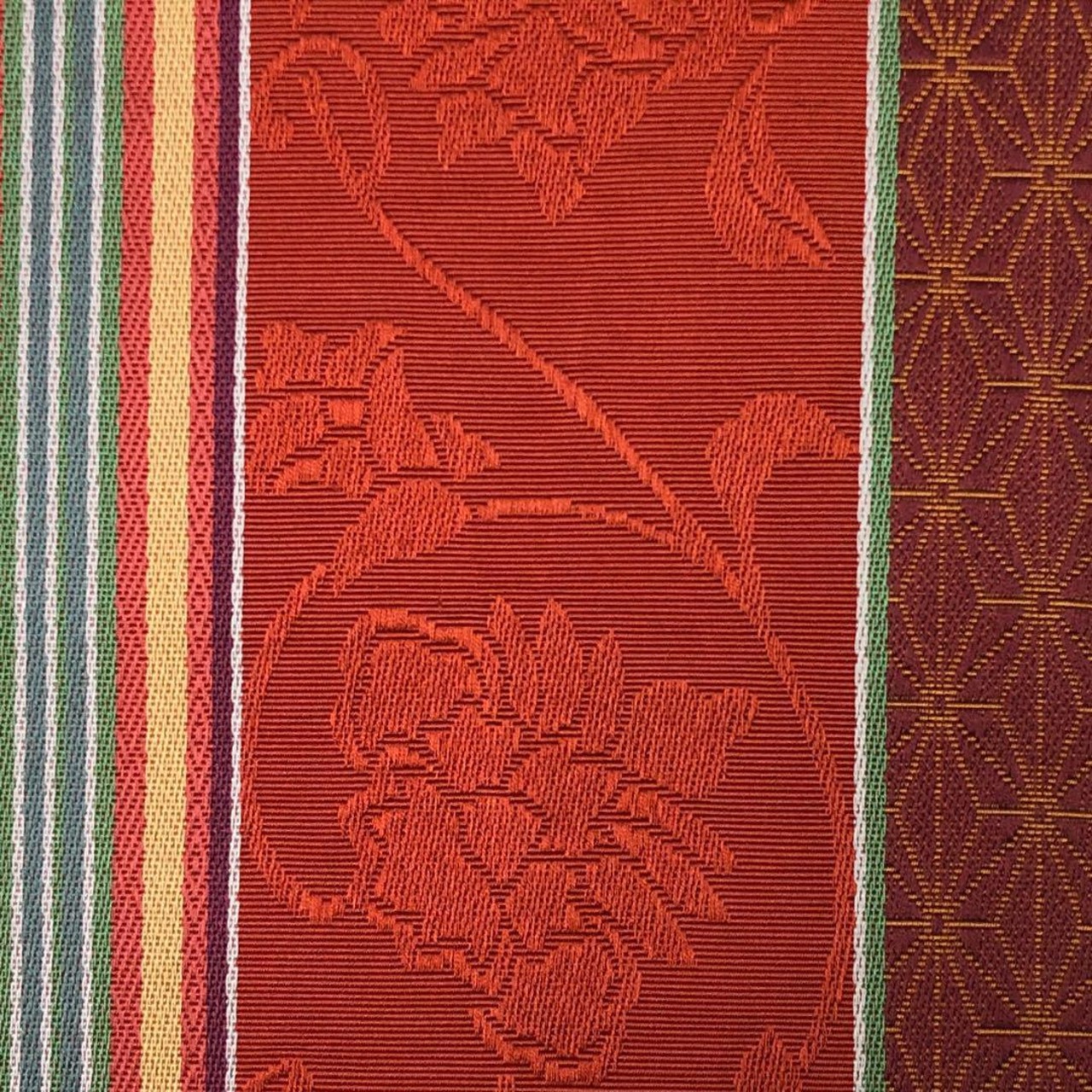 辰砂色ベースのお色味に縦縞に花唐草模様、麻の葉などの柄裄がデザインされた素敵なお品でございます。