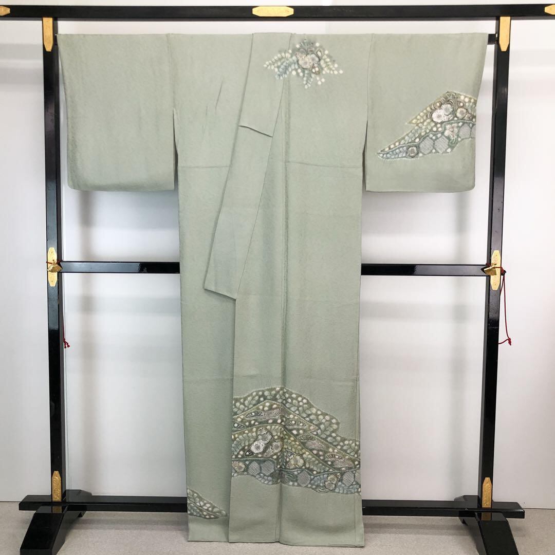 薄灰緑色の上品なお色味に美しい辻が花絞りの柄裄がデザインされた雰囲気の良い素敵なお品でございます。