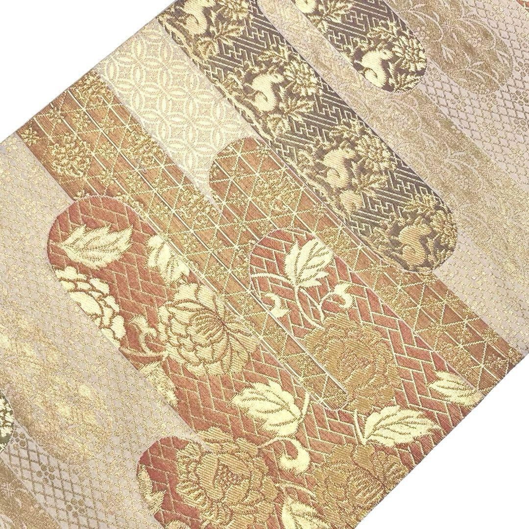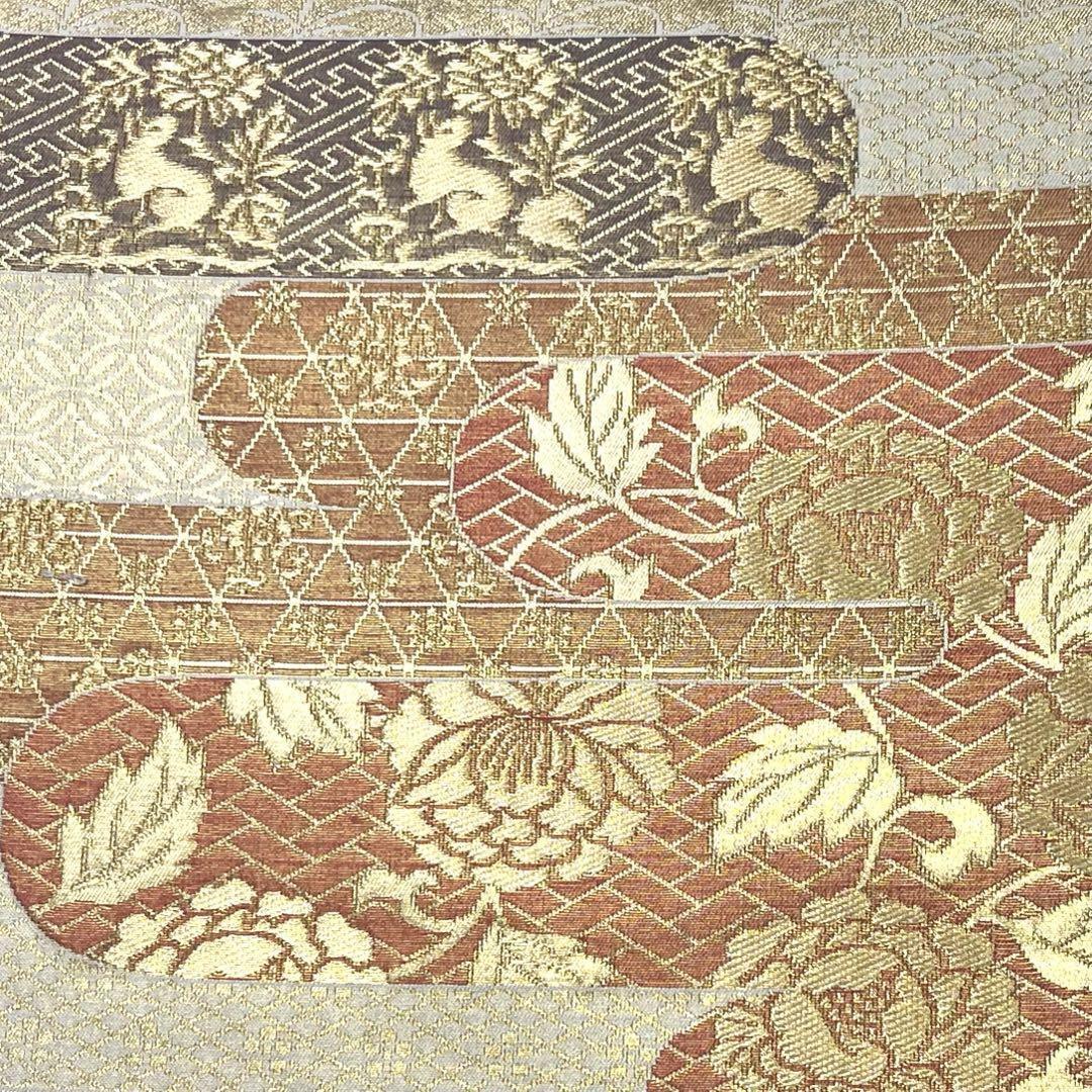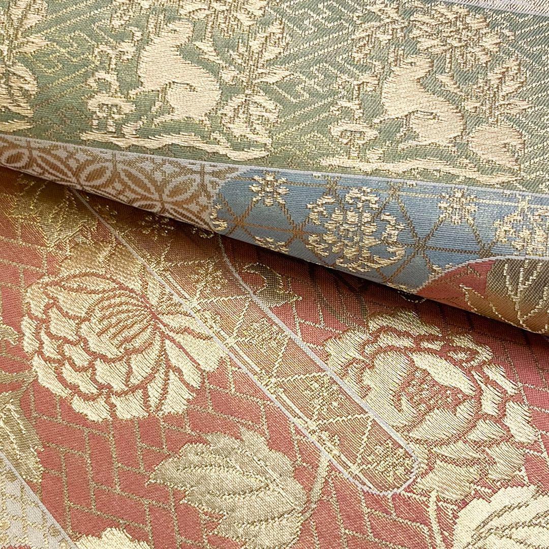 金色の煌びやかなお色味に霞模様、花柄、花兎などの柄裄がデザインされた素敵なお品でございます。