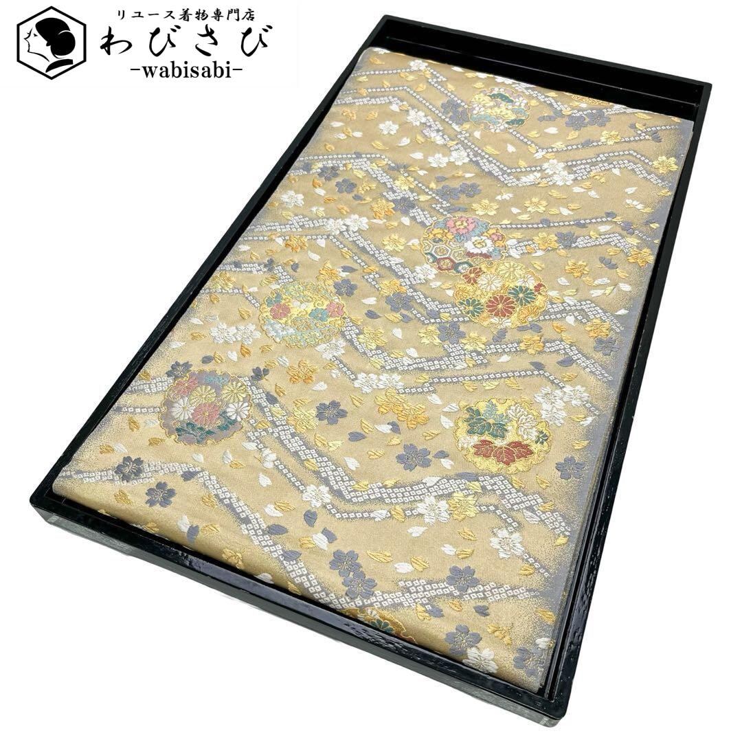 袋帯 雪輪に四季の花柄 鹿の子模様 金銀糸 枯野色 O-4790 着物 きもの kimono 和服 和装 中古 リサイクル着物 【送料無料】