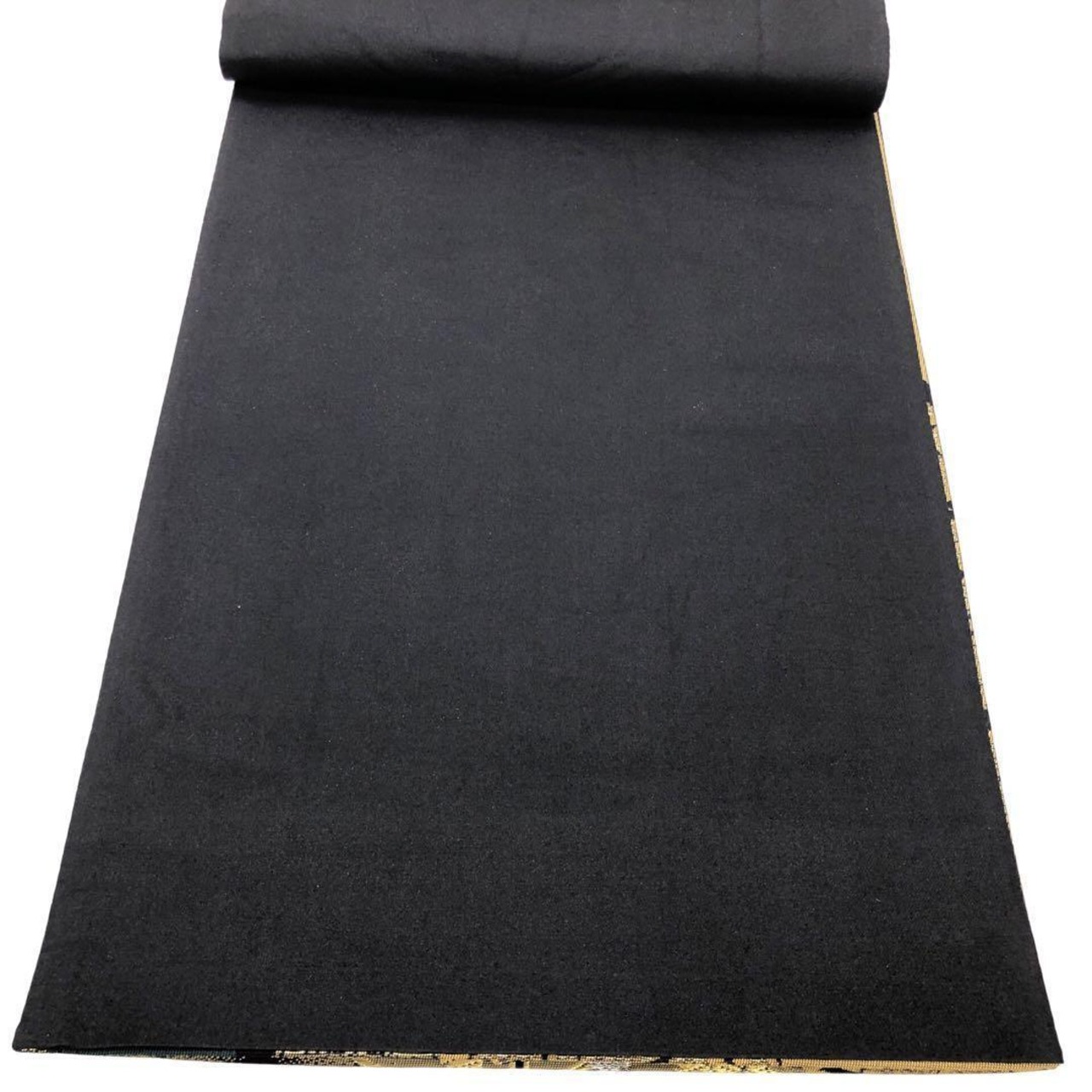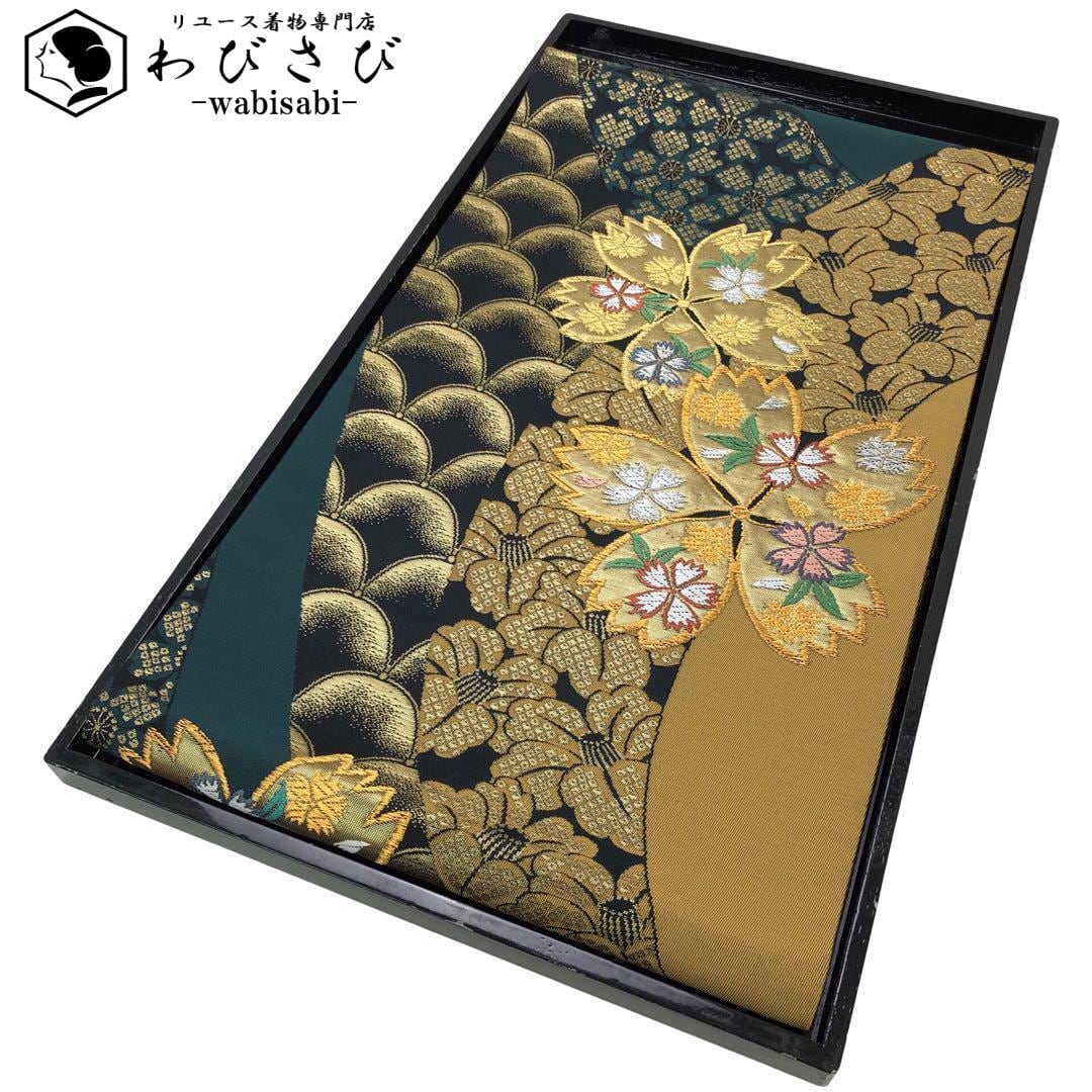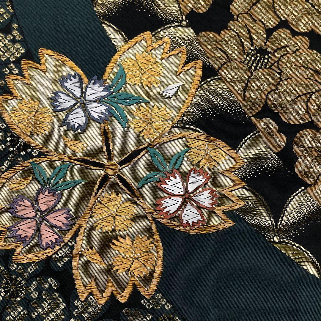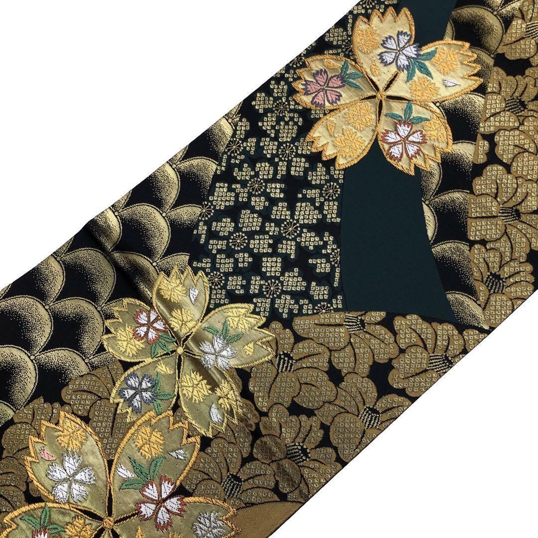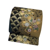 黒色ベースのお色味に金糸の煌びやかな色彩、桜の花、椿、鹿の子模様などの柄裄がデザインされた素敵なお品でございます。