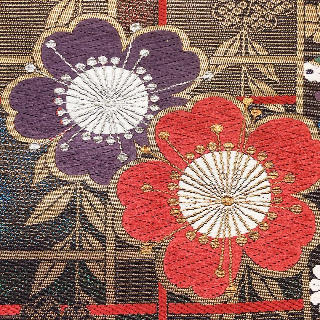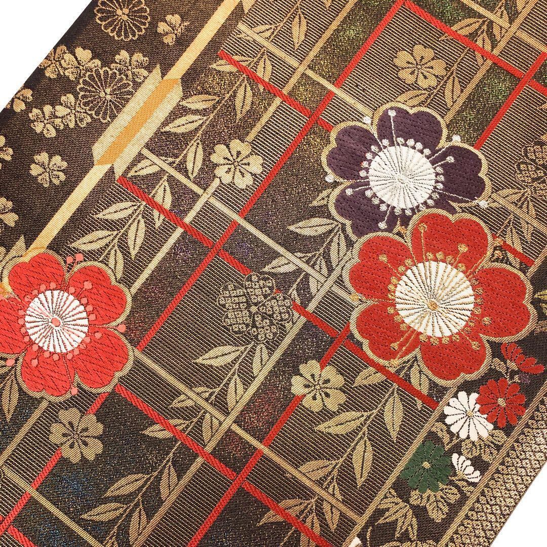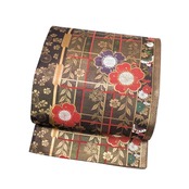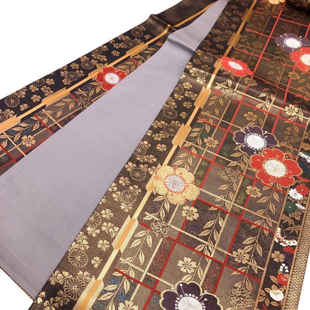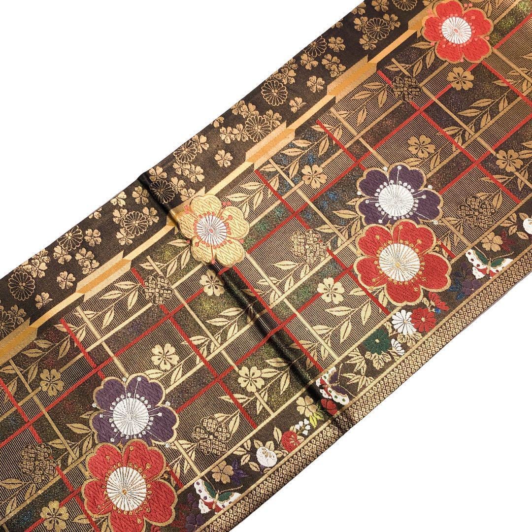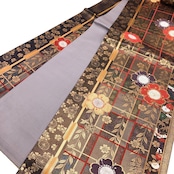 焦茶色ベースのお色味に桜の花模様、蝶々などの柄裄がデザインされた素敵なお品でございます。