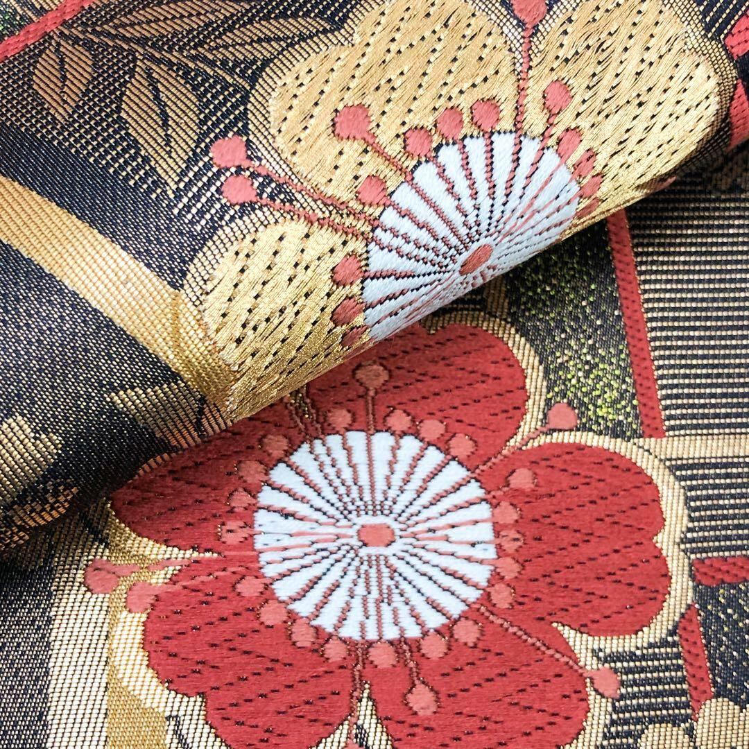 袋帯 桜の花模様に蝶々 菊 金銀糸 焦茶色 振袖 O-4779 着物 きもの kimono 和服 和装 中古 リサイクル着物 【送料無料】