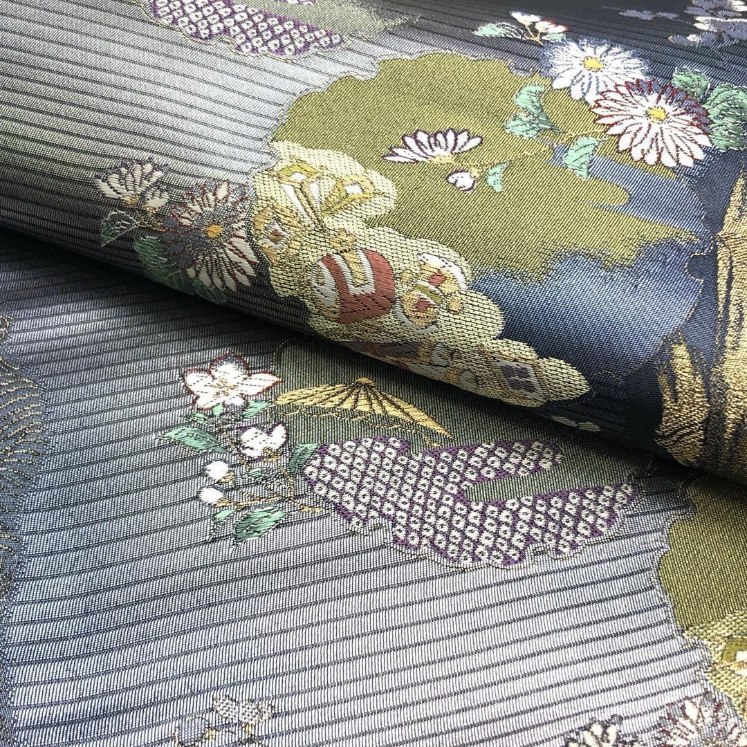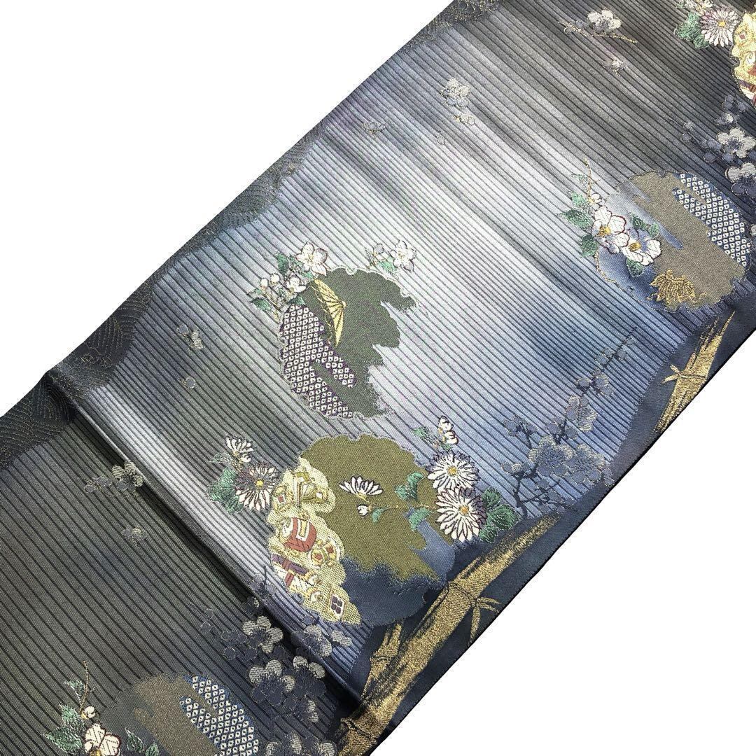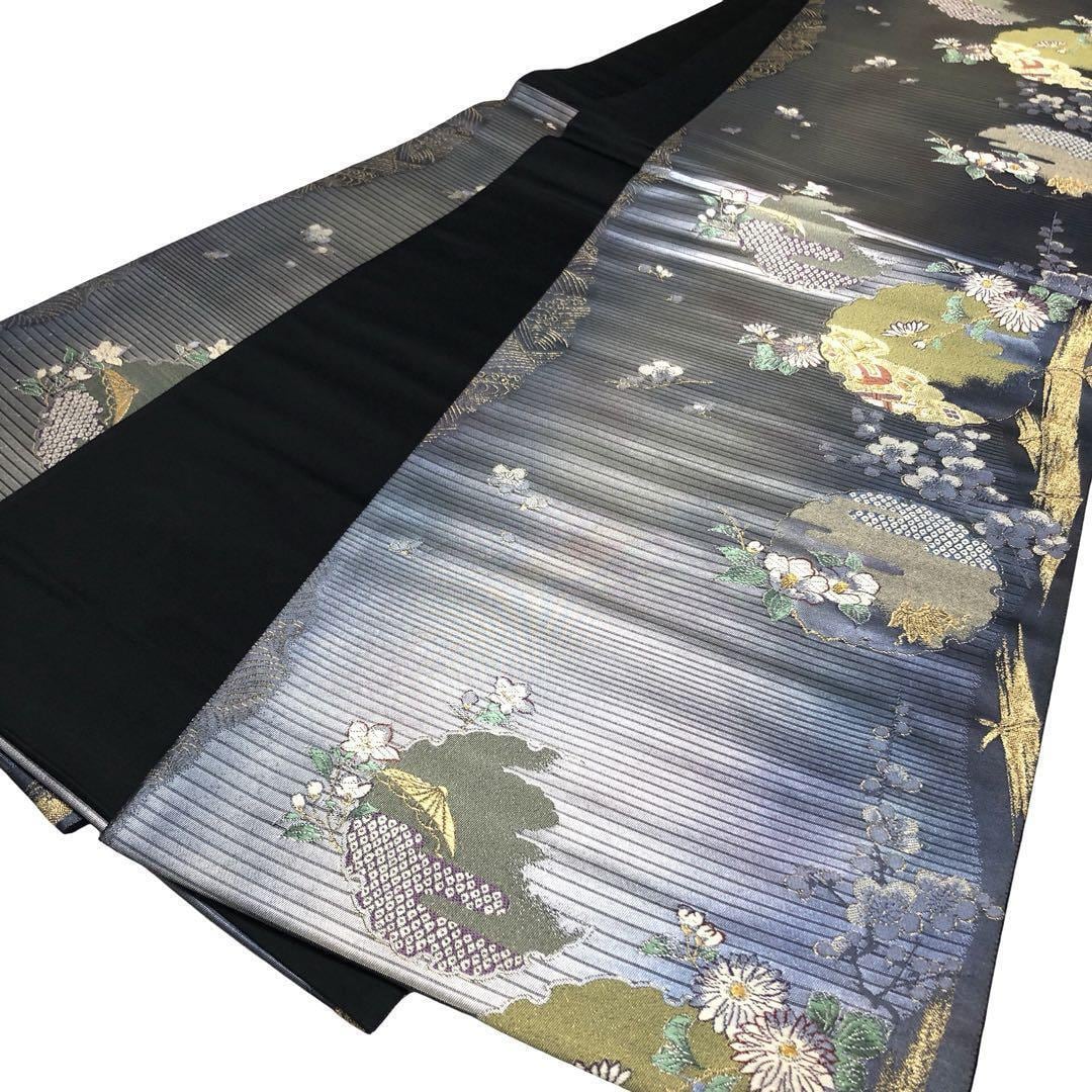 錫紵色のお色味に横縞模様、雪輪に花模様、宝尽くしなどの柄裄がデザインされた素敵なお品でございます。